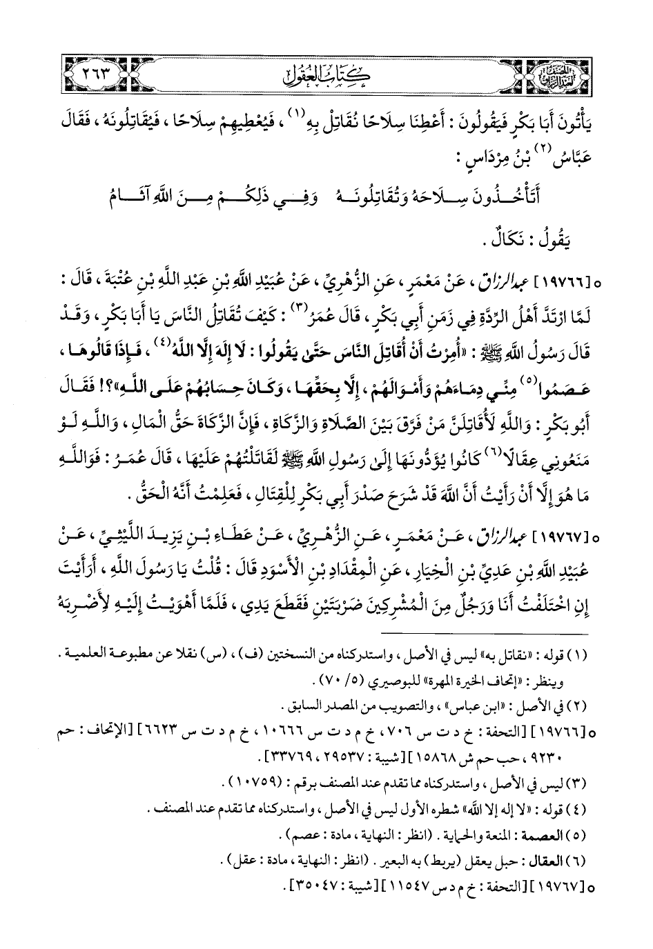 19766 - عبد الرزاق، عَنْ مَعْمَرٍ، عَنِ الزُّهْرِيِّ، عَن عُبَيْدِ اللهِ بْنِ عَبدِ اللهِ بْنِ عُتْبَةَ، قَالَ: لَمَّا ارْتَدَّ أَهْلُ الرِّدَّةِ فِي زَمَنِ أَبِي بَكْرٍ، قَالَ عُمَرُ: كَيْفَ تُقَاتِلُ النَّاسَ يَا أَبَا بَكْرٍ، وَقَدْ قَالَ رَسُولُ اللهِ صَلَّى اللهُ عَلَيْهِ وَسَلَّمَ: أُمِرْتُ أَنْ أُقَاتِلَ النَّاسَ، حَتَّى يَقُولُوا: لاَ إِلَهَ إِلاَّ اللهُ، فَإِذَا قَالُوهَا عَصَمُوا (1) مِنِّي دِمَاءَهُمْ، وَأَمْوَالَهُمْ، إِلاَّ بِحَقِّهَا، وَكَانَ حِسَابُهُمْ عَلَى اللهِ؟ فَقَالَ أَبو بَكْرٍ: وَاللهِ لأُقَاتِلَنَّ مَنْ فَرَّقَ بَيْنَ الصَّلاَةِ وَالزَّكَاةِ، فَإِنَّ الزَّكَاةَ حَقُّ المَالِ، وَاللهِ لَوْ مَنَعُونِي عقالاً (2)، كَانُوا يُؤَدُّونَهَا إِلَى رَسُولِ اللهِ صَلَّى اللهُ عَلَيْهِ وَسَلَّمَ لَقَاتَلْتُهُمْ عَلَيْهَا، قَالَ عُمَرُ: فَوَاللهِ مَا هُوَ إِلاَّ أَنْ رَأَيْتُ أَنَّ اللهَ قَدْ شَرَحَ (3) صَدْرَ أَبِي بَكْرٍ لِلْقِتَالِ، فَعَلِمْتُ أَنَّهُ الْحَقُّ.