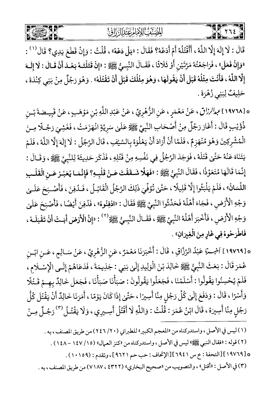 19768 - عبد الرزاق، عَنْ مَعْمَرٍ، عَنِ الزُّهْرِيِّ، عَنْ عَبدِ اللهِ بْنِ مَوْهَبٍ، عَن قَبِيصَةَ بْنِ ذُؤَيْبٍ، قَالَ: أَغَارَ رَجُلٌ مِنْ أَصْحَابِ النَّبِي صَلَّى اللهُ عَلَيْهِ وَسَلَّمَ عَلَى سَرِيَّةٍ انَهَزَمَتْ، فَغَشِيَ رَجُلاً مِنَ المُشْرِكِينَ، وَهُوَ مُنْهَزِمٌ، فَلَمَّا [أَنْ] (1) أَرَادَ أَنْ يَعْلُوَهُ بِالسَّيْفِ، قَالَ الرَّجُلُ: لاَ إِلَهَ إِلاَّ اللهُ، فَلَمْ يَتَنَاهَ عَنْهُ، حَتَّى قَتَلَهُ، فَوَجَدَ الرَّجُلُ فِي نَفْسِهِ مِنْ قَتْلِهِ، فَذَكَرَ حَدِيثَهُ لِلنَّبِيِّ صَلَّى اللهُ عَلَيْهِ وَسَلَّمَ، وَقَالَ: إِنَّمَا قَالَهَا مُتَعَوِّذًا، فَقَالَ النَّبِيُّ صَلَّى اللهُ عَلَيْهِ وَسَلَّمَ: فَهَلاَّ شَقَقْتَ (2) عَن قَلْبِهِ، فَإِنَّمَا يُعَبِّرُ عَنِ الْقَلْبِ اللِّسَانُ، فَلَمْ يَلْبَثُوا إِلاَّ قَلِيلاً، حَتَّى تُوُفِّيَ ذَلِكَ الرَّجُلُ الْقَاتِلُ، فَدُفِنَ، فَأَصْبَحَ عَلَى وَجْهِ الأَرْضِ، فَجَاءَ أَهْلُهُ، فَحَدَّثُوا النَّبِيَّ صَلَّى اللهُ عَلَيْهِ وَسَلَّمَ فَقَالَ: ادْفِنُوهُ، فَدُفِنَ أَيْضًا، فَأَصْبَحَ عَلَى وَجْهِ الأَرْضِ، فَأَخْبَرَ أَهْلُهُ النَّبِيَّ صَلَّى اللهُ عَلَيْهِ وَسَلَّمَ، فَقَالَ النَّبِيُّ صَلَّى اللهُ عَلَيْهِ وَسَلَّمَ: إِنَّ الأَرْضَ أَبَتْ أَنْ تَقْبَلَهُ، فَاطْرَحُوهُ فِي غَارٍ مِنَ الْغِيرِانِ.