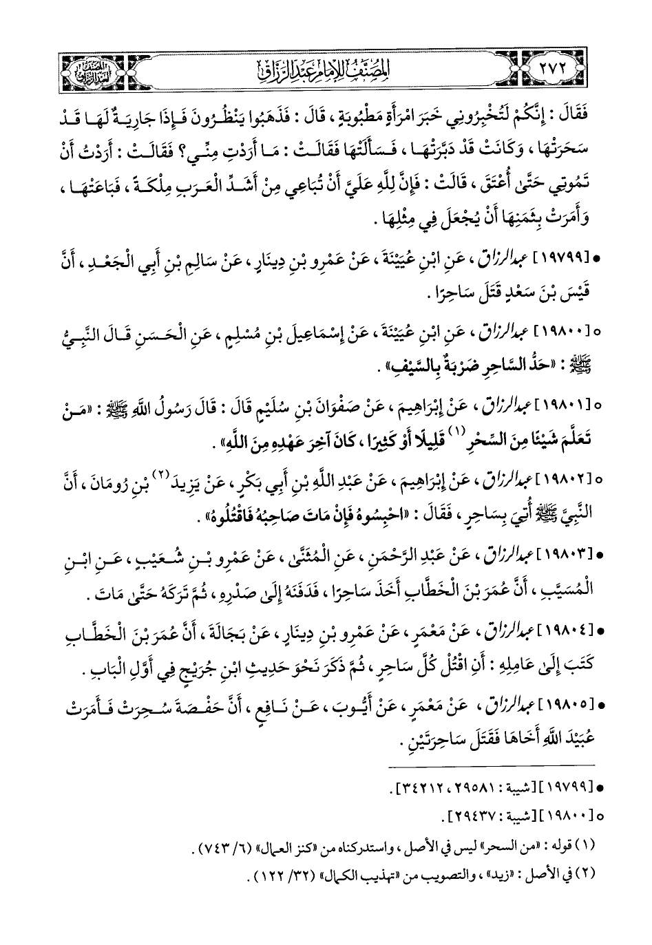 19805- عبد الرزاق، عَنْ مَعْمَرٍ، عَنْ أَيُّوبَ، عَن نَافِعٍ؛ أَنَّ حَفْصَةَ سُحِرَتْ، فَأَمَرَتْ عُبَيْدَ اللهِ أَخَاهَا، فَقَتَلَ سَاحِرَتَيْنِ.