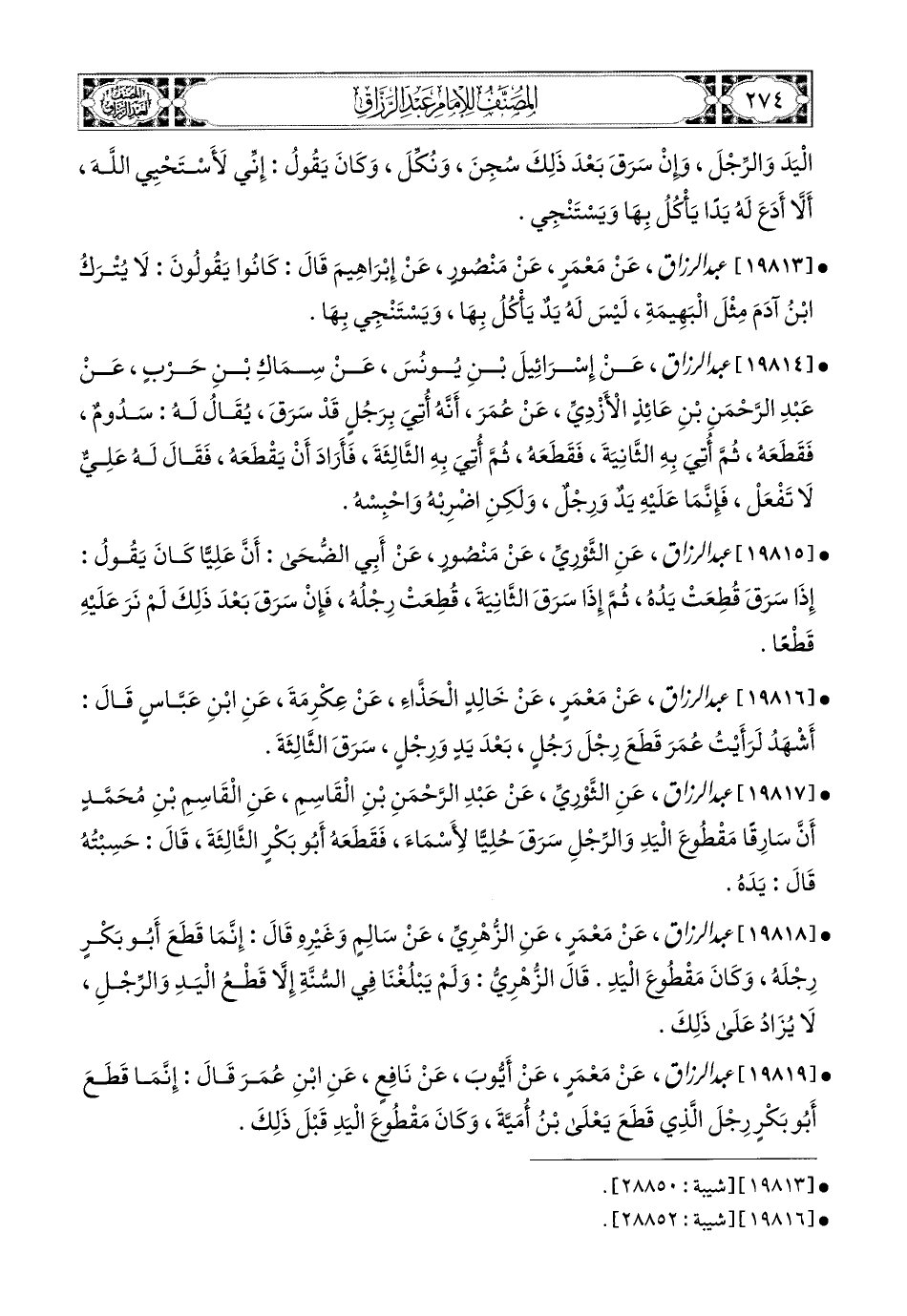 19819- عبد الرزاق، عَنْ مَعْمَرٍ، عَنْ أَيُّوبَ، عَن نَافِعٍ، عَنِ ابْنِ عُمَرَ، قَالَ: إِنَّمَا قَطَعَ أَبو بَكْرٍ رِجْلَ الَّذِي قَطَعَ يَعْلَى بن أُمَيَّةَ، وَكَانَ مَقْطُوعَ الْيَدِ قَبْلَ ذَلِكَ.