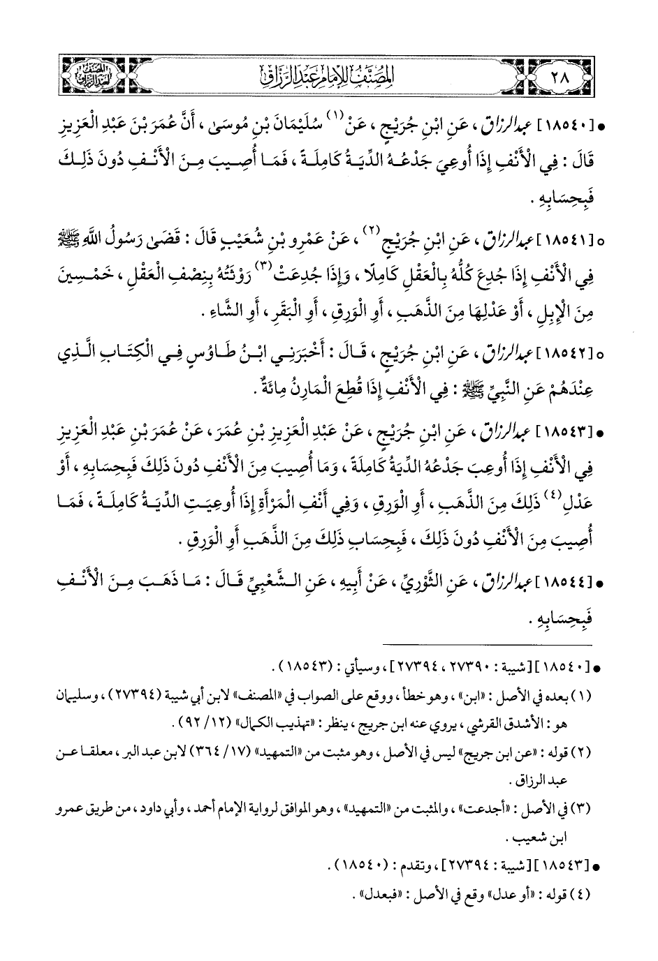 18543- عبد الرزاق، عَنِ ابْنِ جُرَيْجٍ، عَنْ عَبدِ الْعَزِيزِ بْنِ عُمَرَ، عَن عُمَرَ بْنِ عَبدِ الْعَزِيزِ، فِي الأَنْفِ إِذَا أُوعِبَ جَدْعُهُ الدِّيَةُ كَامِلَةً، وَمَا أُصِيبَ مِنَ الأَنْفِ دُونَ ذَلِكَ فَبِحِسَابِهِ، أَوْ عَدْلِ ذَلِكَ مِنَ الذَّهَبِ، أَوِ الْوَرِقِ، وَفِي أَنْفِ المَرْأَةِ إِذَا أَوْعِيَتِ (1) الدِّيَةُ كَامِلَةً، فَمَا أُصِيبَ مِنَ الأَنْفِ دُونَ ذَلِكَ، فَبِحِسَابِ ذَلِكَ مِنَ الذَّهَبِ، أَوِ الْوَرِقِ.