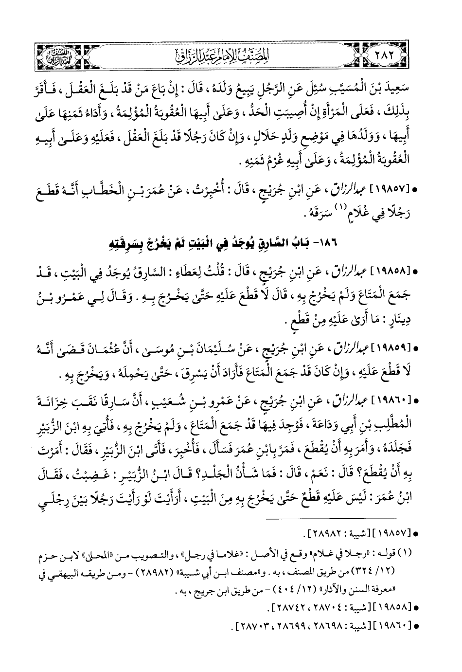 19860- عبد الرزاق، عَنِ ابْنِ جُرَيْجٍ، عَنْ عَمْرِو بنِ شُعَيْبٍ، أَنَّ سَارِقًا نَقَبَ خِزَانَةَ المُطَّلِبِ بْنِ أَبِي وَدَاعَةَ، فَوُجِدَ فِيهَا قَدْ جَمَعَ المَتَاعَ، وَلَمْ يَخْرُجْ بِهِ، فَأُتِيَ بِهِ ابْنُ الزُّبَيْرِ، فَجَلَدَهُ، وَأَمَرَ بِهِ أَنْ يُقْطَعَ، فَمَرَّ بِابْنِ عُمَرَ، فَسَأَلَ، فَأُخْبِرَ، فَأَتَى ابْنَ الزُّبَيْرِ، فَقَالَ: أَمَرْتَ بِهِ أَنْ يُقْطَعَ؟ قَالَ: نَعَمْ، قَالَ: فَمَا شَأْنُ الْجَلْدِ؟ قَالَ ابْنُ الزُّبَيْرِ: غَضِبْتُ، فَقَالَ (1) ابْنُ عُمَرَ: لَيْسَ عَلَيْهِ قَطْعٌ، حَتَّى يَخْرُجَ بِهِ مِنَ الْبَيْتِ، أَرَأَيْتَ لَوْ رَأَيْتَ رَجُلاً بَيْنَ رِجْلَيِ امْرَأَةٍ، لَمْ يُصِبْهَا، أَكُنْتَ حَادَّهُ؟ قَالَ: لاَ، قَالَ: فَلَعَلَّهُ (2) سَوْفَ يَتُوبُ قَبْلَ أَنْ يُوَاقِعَهَا، قَالَ: وَهَذَا كَذَلِكَ، مَا يُدْرِيكَ لَعَلَّهُ قَدْ كَانَ نَازِعًا، وَتَائِبًا، وَتَارِكًا لِلْمَتَاعِ.
