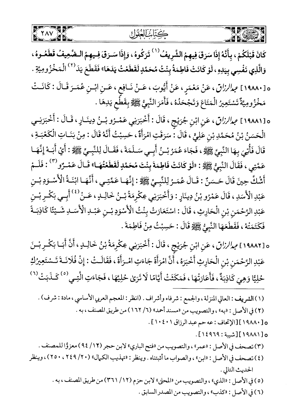 19880- عبد الرزاق، عَنْ مَعْمَرٍ، عَنْ أَيُّوبَ، عَن نَافِعٍ، عَنِ ابْنِ عُمَرَ، قَالَ: كَانَتْ مَخْزُومِيَّةٌ تَسْتَعِيرُ المَتَاعَ وَتَجْحَدُهُ، فَأَمَرَ النَّبِيُّ صَلَّى اللهُ عَلَيْهِ وَسَلَّمَ بِقَطْعِ يَدِهَا (1).