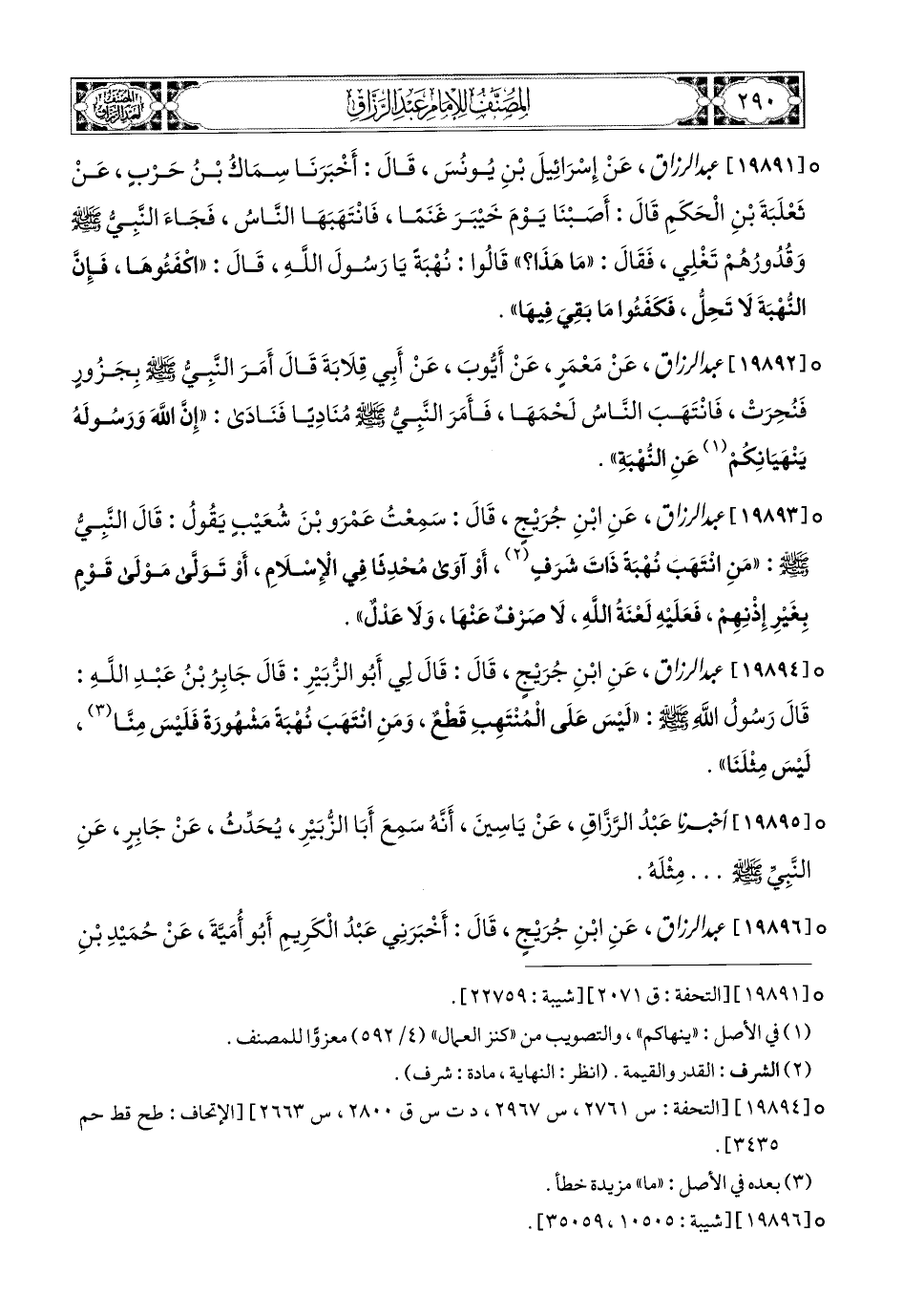 19892- عبد الرزاق، عَنْ مَعْمَرٍ، عَنْ أَيُّوبَ، عَنْ أَبِي قِلاَبَةَ، قَالَ: أَمَرَ النَّبِيُّ صَلَّى اللهُ عَلَيْهِ وَسَلَّمَ بِجَزُورٍ فَنُحِرَتْ، فَانْتَهَبَ النَّاسُ لَحْمَهَا، فَأَمَرَ النَّبِيُّ صَلَّى اللهُ عَلَيْهِ وَسَلَّمَ مُنَادِيًا فَنَادَى: إِنَّ اللهَ وَرَسُولَهُ يَنْهَيَانِكُمْ عَنِ النُّهْبَةِ.