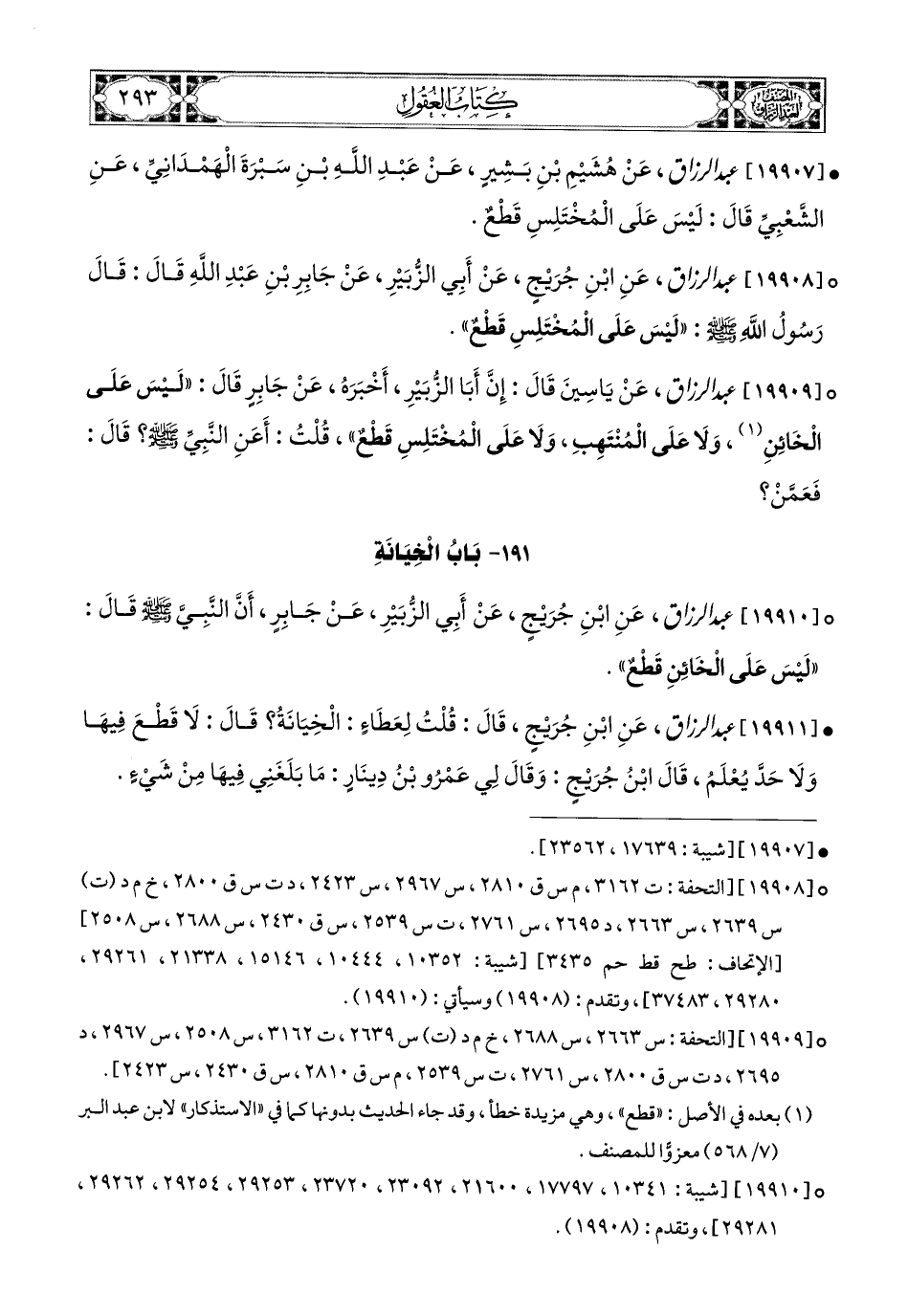 19909- عبد الرزاق، عَن يَاسِينَ، قَالَ: إِنَّ أَبَا الزُّبَيْرِ أَخْبَرَهُ، عَن جَابِرٍ، قَالَ: لَيْسَ عَلَى الْخَائِنِ، وَلاَ عَلَى المُنْتَهِبِ، وَلاَ عَلَى المُخْتَلِسِ قَطْعٌ، قُلْتُ: أَعَنِ النَّبِيِّ صَلَّى اللهُ عَلَيْهِ وَسَلَّمَ؟ قَالَ: فَعَنْ مَنْ.