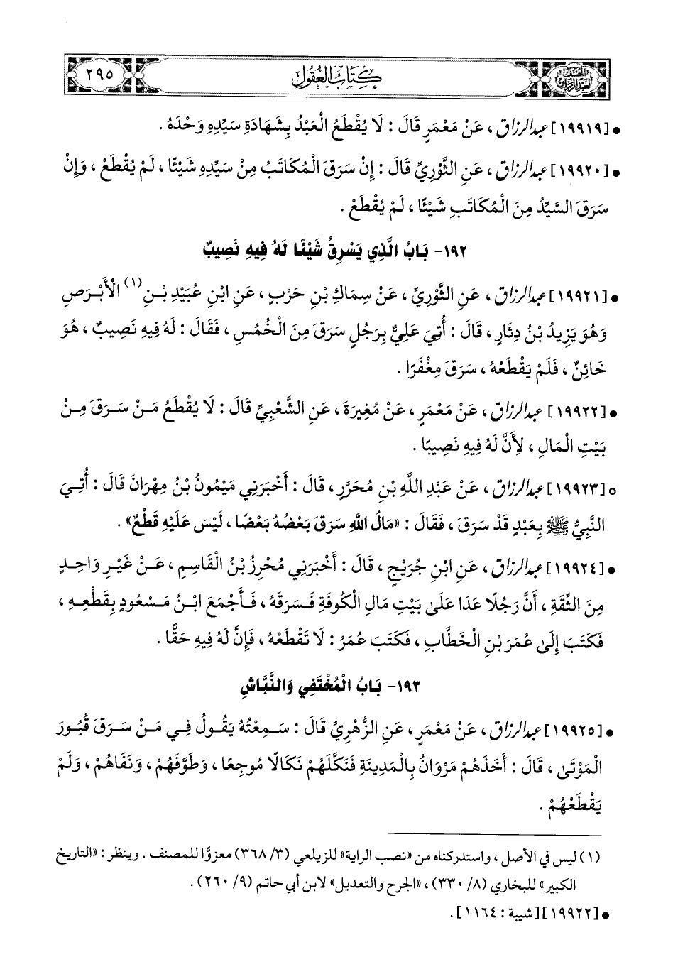 19922- عبد الرزاق، عَنْ مَعْمَرٍ، عَن مُغِيرَةَ، عَنِ الشَّعْبِيِّ، قَالَ: لاَ يُقْطَعُ مَنْ سَرَقَ مِنْ بَيْتِ المَالِ، لأَنَّ لَهُ فِيهِ نَصِيبًا.