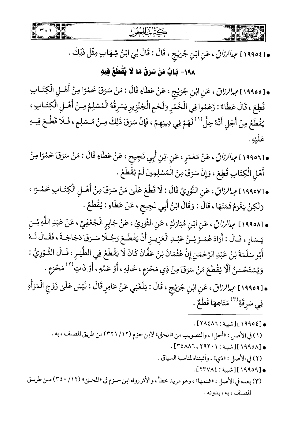 19955- عبد الرزاق، عَنِ ابْنِ جُرَيْجٍ، عَنْ عَطَاءٍ، قَالَ: مَنْ سَرَقَ خَمْرًا مِنْ أَهْلِ الْكِتَابِ قُطِعَ، قَالَ عَطَاءٌ: زَعَمُوا فِي الْخَمْرِ، وَلَحْمِ الْخِنْزِيرِ يَسْرِقُهُ المُسْلِمُ مِنْ أَهْلِ الْكِتَابِ، يُقْطَعُ، مِنْ أَجْلِ أَنَّهُ لَهُمْ حِلٌّ (1) فِي دِينِهِمْ، فَإِنْ سَرَقَ ذَلِكَ مِنْ مُسْلِمٍ، فَلاَ قَطْعَ فِيهِ [عَلَيْه] (2).