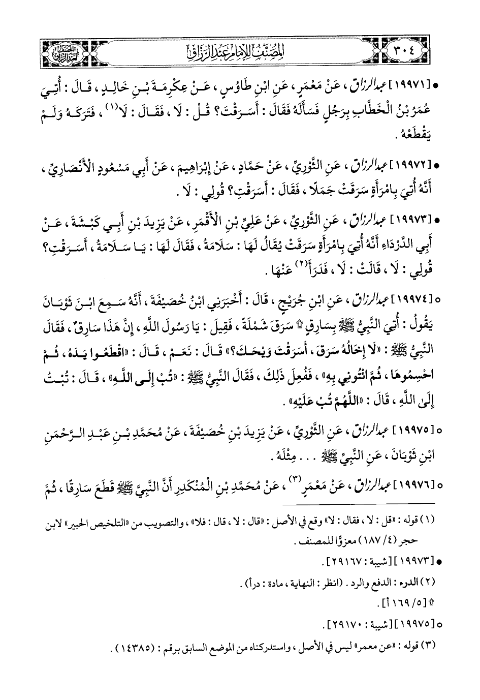 19976- عبد الرزاق، عَنْ مَعْمَرٍ، عَن مُحَمَّدِ بْنِ المُنْكَدِرِ؛ أَنَّ النَّبِيَّ صَلَّى اللهُ عَلَيْهِ وَسَلَّمَ قَطَعَ سَارِقًا، ثُمَّ أَمَرَ بِهِ، فَحُسِمَ، ثُمَّ قَالَ: تُبْ إِلَى اللهِ، قَالَ: أَتُوبُ إِلَى اللهِ، قَالَ: اللهُمَّ تُبْ عَلَيْهِ، ثُمَّ قَالَ النَّبِيُّ صَلَّى اللهُ عَلَيْهِ وَسَلَّمَ: إِنَّ السَّارِقَ إِذَا قُطِعَتْ يَدُهُ، وَقَعَتْ فِي النَّارِ، فَإِنْ عَادَ تَبِعَهَا، وَإِنْ تَابَ اسْتَشْلاَهَا، يَعْنِي اسْتَرْجَعَهَا.