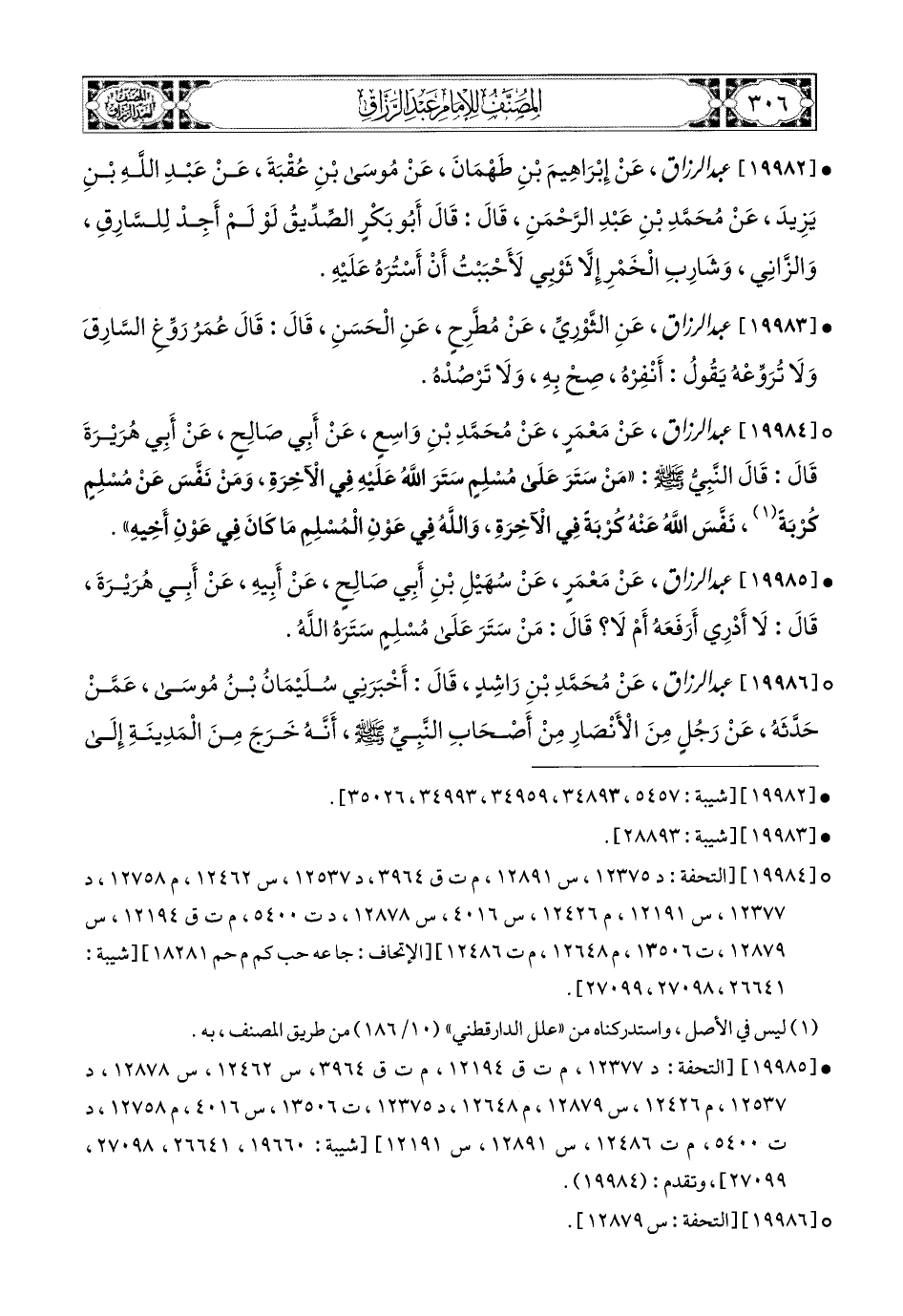 19986- عبد الرزاق، عَنْ مُحَمَّدِ بن رَاشِدٍ، قَالَ: أَخْبَرَنِي (1) سُلَيْمَانُ بن مُوسَى، عَمَّنْ حَدَّثَهُ، عَن رَجُلٍ مِنَ الأَنْصَارِ مِنْ أَصْحَابِ النَّبِيِّ صَلَّى اللهُ عَلَيْهِ وَسَلَّمَ، أَنَّهُ خَرَجَ مِنَ المَدِينَةِ إِلَى عُقْبَةَ بْنِ عَامِرٍ وَهُوَ أَمِيرٌ عَلَى مِصْرَ، يَسْأَلُهُ عَن حَدِيثٍ سَمِعَاهُ (2) مِنْ رَسُولِ اللهِ صَلَّى اللهُ عَلَيْهِ وَسَلَّمَ جَمِيعًا يَسْتَبِينُهُ مِنْهُ، فَقَالَ عُقْبَةُ: سَمِعْتُ رَسُولَ اللهِ صَلَّى اللهُ عَلَيْهِ وَسَلَّمَ يَقُولُ: مَنْ سَتَرَ أَخَاهُ فِي فَاحِشَةٍ رَآهَا عَلَيْهِ، سَتَرَهُ اللهُ فِي الدُّنْيَا وَالآخِرَةِ.