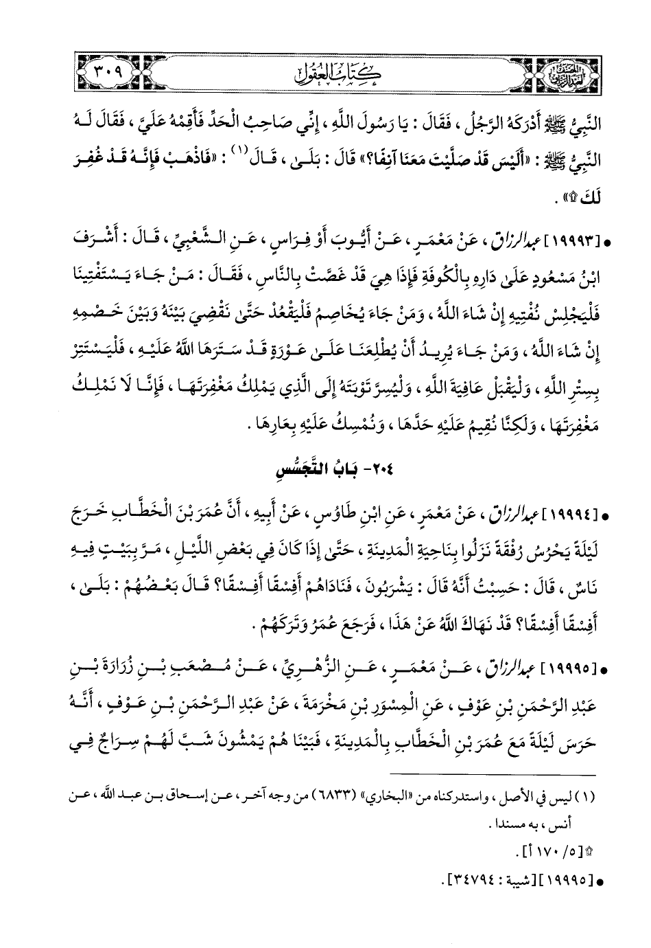 19995 - عبد الرزاق، عَنْ مَعْمَرٍ، عَنِ الزُّهْرِيِّ، عَن مُصْعَبِ بْنِ زُرَارَةَ بْنِ عَبدِ الرَّحْمَنِ بْنِ عَوْفٍ، عَنِ المِسْوَرِ بْنِ مَخْرَمَةَ، عَنْ عَبدِ الرَّحْمَنِ بْنِ عَوْفٍ، أَنَّهُ حَرَسَ لَيْلَةً مَعَ عُمَرَ بْنِ الْخَطَّابِ [بِالمَدِينَة] (1) فَبَيْنَا هُمْ يَمْشُونَ شَبَّ لَهُمْ سِرَاجٌ فِي بَيْتٍ، فَانْطَلَقُوا يَرُمُونَهُ، حَتَّى إِذَا دَنَوْا مِنْهُ إِذَا بَابٌ مُجَافٍ عَلَى أَقْوَامٍ (2) لَهُمْ فِيهِ أَصْوَاتٌ مُرْتَفِعَةٌ وَلَغَطٌ، [قَالَ] (3) فَقَالَ عُمَرُ: وَأَخَذَ بِيَدِ عَبدِ الرَّحْمَنِ: ثُمَّ قَالَ: أَتَدْرِي بَيْتُ مَنْ هَذَا؟ قَالَ: قُلْتُ: لاَ، قَالَ: هُوَ بَيْتُ رَبِيعَةَ بْنِ أُمَيَّةَ بْنِ خَلَفٍ، وَهُمُ الآنَ شُرَّبٌ، فَمَا تَرَى؟ قَالَ عَبدُ الرَّحْمَنِ: أَرَى قَدْ أَتَيْنَا مَا نَهَانَا اللهُ عَنْهُ، فَقَالَ: {وَلاَ تَجَسَّسُوا} فَقَدْ تَجَسَّسْنَا، فَانْصَرَفَ عَنْهُمْ عُمَرُ وَتَرَكَهُمْ.