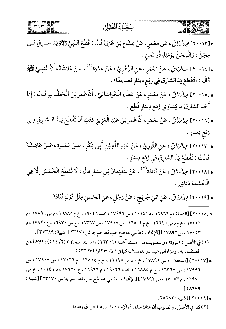 20014- عبد الرزاق، عَنْ مَعْمَرٍ، عَنِ الزُّهْرِيِّ، عَنْ عَمْرَةَ، عَنْ عَائِشَةَ، أَنَّ النَّبِيَّ صَلَّى اللهُ عَلَيْهِ وَسَلَّمَ قَالَ: تُقْطَعُ يَدُ السَّارِقِ فِي رُبُعِ دِينَارٍ فَصَاعِدًا.
