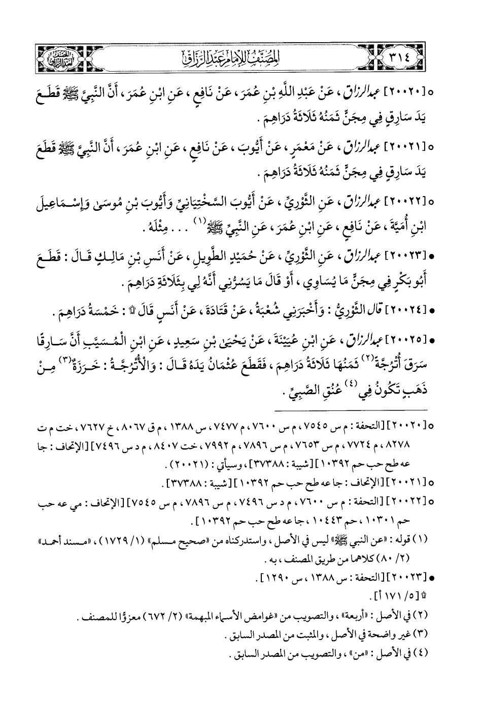 20020- عبد الرزاق، عَنْ عَبدِ اللهِ بْنِ عُمَرَ، عَن نَافِعٍ، عَنِ ابْنِ عُمَرَ؛ أَنَّ النَّبِيَّ صَلَّى اللهُ عَلَيْهِ وَسَلَّمَ قَطَعَ يَدَ سَارِقٍ فِي مِجَنٍّ ثَمَنُهُ ثَلاَثَةُ دَرَاهِمَ.