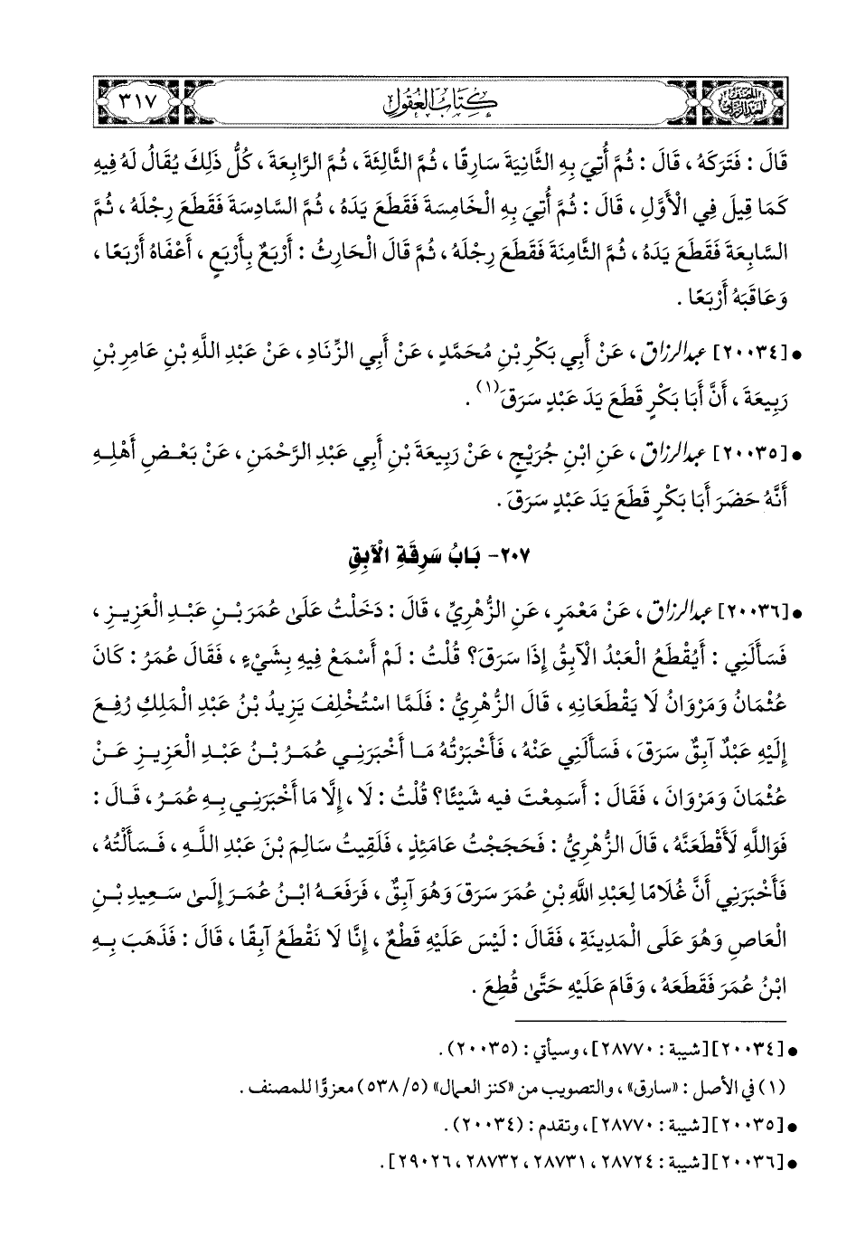 20034- عبد الرزاق، عَنْ أَبِي بَكْرِ بْنِ مُحَمَّدٍ، عَنْ أَبِي الزِّنَادِ، عَنْ عَبدِ اللهِ بْنِ عَامِرٍ بْنِ رَبِيعَةَ، أَنَّ أَبَا بَكْرٍ قَطَعَ يَدَ عَبدٍ سَرَقَ.