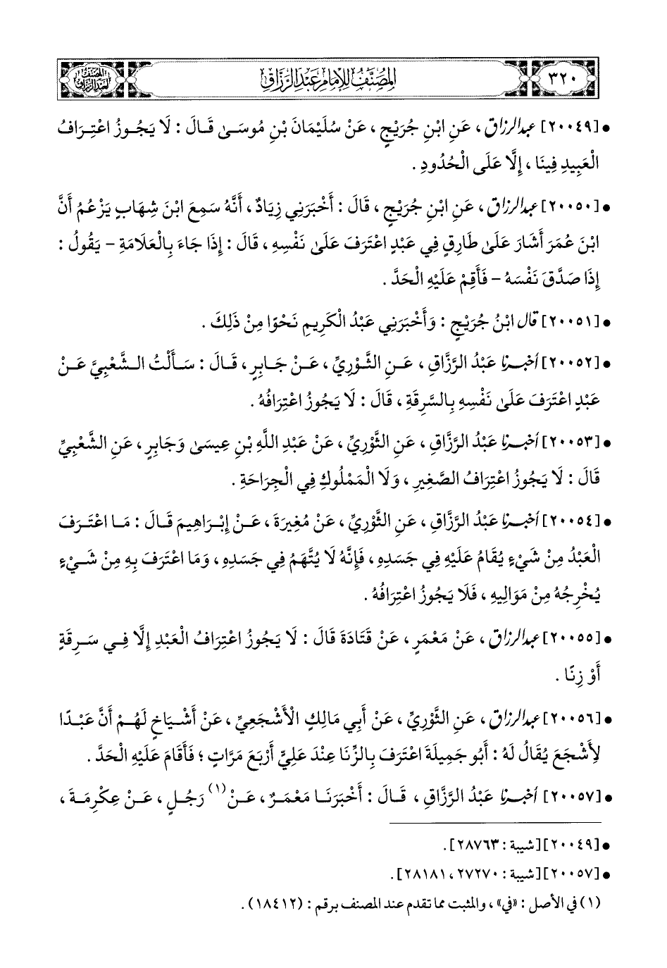 20049- عبد الرزاق، عَنِ ابْنِ جُرَيْجٍ، عَن سُلَيْمَانَ بْنِ مُوسَى، قَالَ: لاَ يَجُوزُ اعْتِرَافُ الْعَبِيدِ فِينَا، إِلاَّ عَلَى الْحُدُودِ.