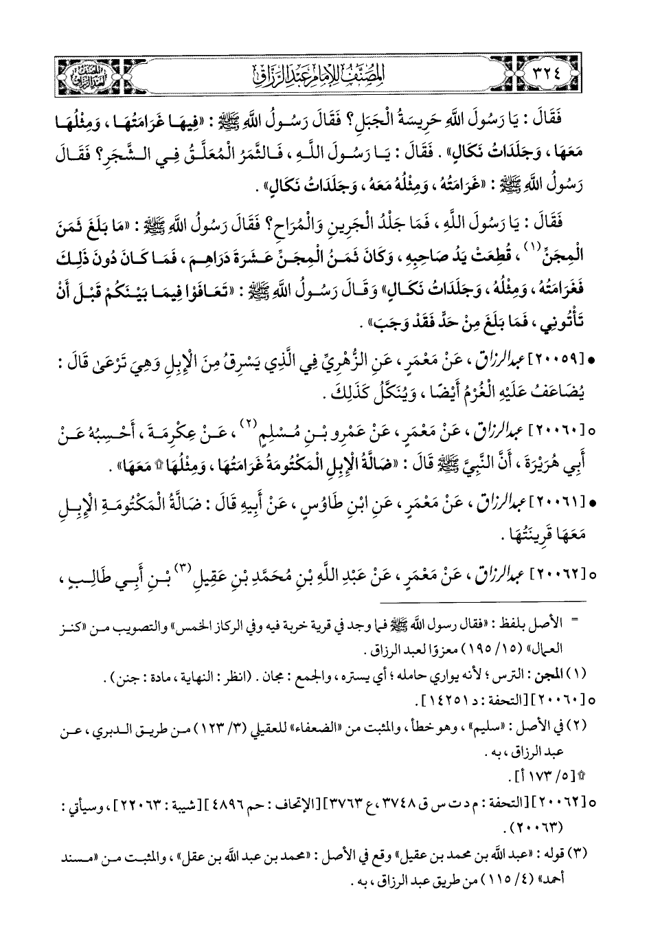 20060- عبد الرزاق، عَنْ مَعْمَرٍ، عَنْ عَمْرِو بنِ مُسْلِمٍ، عَنْ عِكْرِمَةَ، أَحْسَبُهُ عَنْ أَبِي هُرَيرَةَ، أَنَّ النَّبِيَّ صَلَّى اللهُ عَلَيْهِ وَسَلَّمَ قَالَ: ضَالَّةُ الإِبِلِ المَكْتُومَةِ غَرَامَتُهَا وَمِثْلُهَا مَعَهَا.