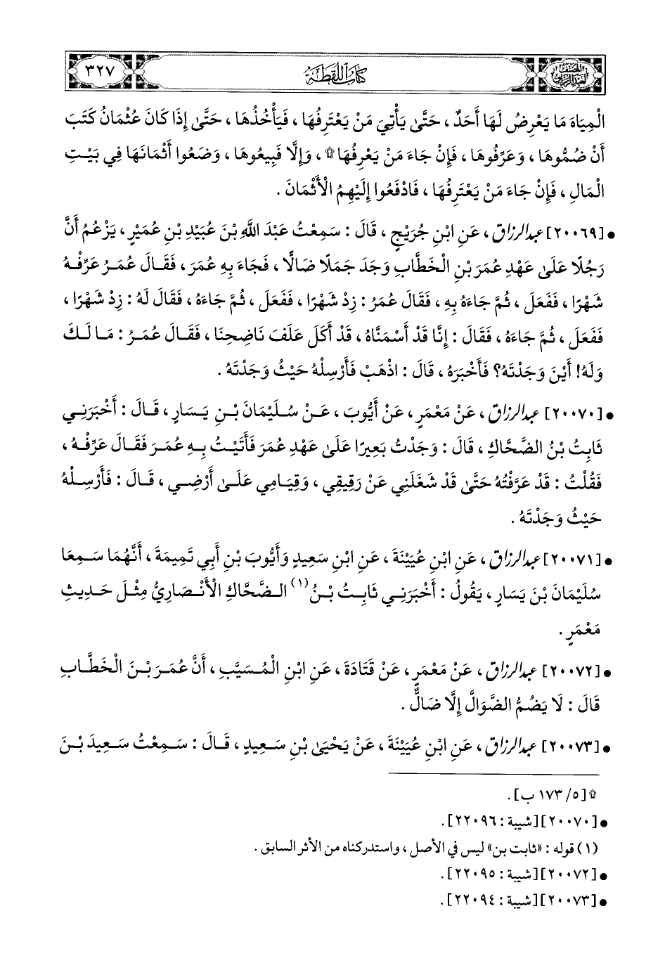 20070- عبد الرزاق، عَنْ مَعْمَرٍ، عَنْ أَيُّوبَ، عَن سُلَيْمَانَ بْنِ يَسَارٍ، قَالَ: أَخْبَرَنِي ثَابِتُ بن الضَّحَّاكِ، قَالَ: وَجَدْتُ بَعِيرًا عَلَى عَهْدِ عُمَرَ، فَأَتَيْتُ بِهِ عُمَرَ، فَقَالَ: عَرِّفْهُ، فَقُلْتُ: قَدْ عَرَّفْتُهُ، حَتَّى قَدْ شَغَلَنِي عَن رَقِيقِي، وَقِيَامِي عَلَى أَرْضِي، قَالَ: فَأَرْسِلْهُ حَيْثُ وَجَدْتَهُ.