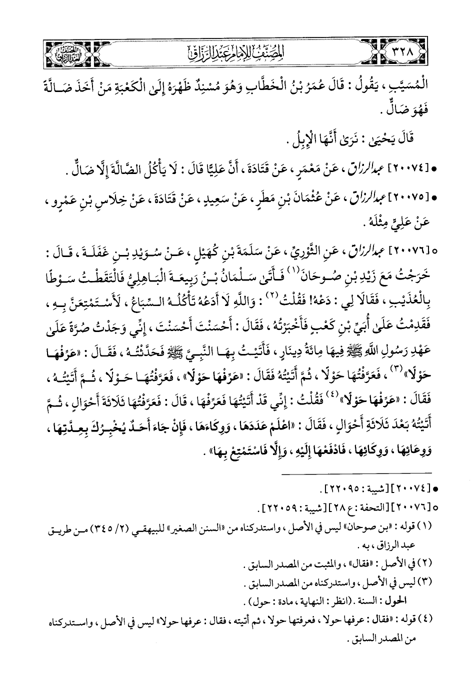 20076- عبد الرزاق، عَنِ الثَّورِيِّ، عَن سَلَمَةَ بْنِ كُهَيْلٍ، عَن سُوَيْدِ بْنِ غَفَلَةَ، قَالَ: خَرَجْتُ مَعَ زَيْدِ بْنِ صُوحَانَ، فَأَتَى سَلْمَانُ بْنُ رَبِيعَةَ الْبَاهِلِيِّ، فَالْتَقَطْتُ سَوْطًا بِالْعُذَيْبِ، فَقَالاَ لِي: دَعْهُ، فَقُلْتُ: وَاللهِ لاَ أَدَعُهُ تَأْكُلُهُ السِّبَاعُ، لأَسْتَمْتِعَنَّ بِهِ، فَقَدِمْتُ عَلَى أُبَيِّ بْنِ كَعْبٍ، فَأَخْبَرْتُهُ، فَقَالَ: أَحْسَنْتَ أَحْسَنْتَ، إِنِّي وَجَدْتُ صُرَّةً عَلَى عَهْدِ رَسُولِ اللهِ صَلَّى اللهُ عَلَيْهِ وَسَلَّمَ فِيهَا مِئَةُ دِينَارٍ، فَأَتَيْتُ بِهَا النَّبِيَّ صَلَّى اللهُ عَلَيْهِ وَسَلَّمَ فَحَدَّثْتُهُ، فَقَالَ: عَرِّفْهَا حَوْلاً، فَعَرَّفْتُهَا حَوْلاً، ثُمَّ أَتَيْتُهُ، فَقَالَ: عَرِّفْهَا حَوْلاً، فَعَرَّفْتُهَا حَوْلاً، ثُمَّ أَتَيْتُهُ، فَقَالَ: عَرِّفْهَا حَوْلاً، فَقُلْتُ: إِنِّي قَدْ أَتَيْتُهَا فَعَرِّفْهَا، قَالَ: فَعَرَّفْتُهَا ثَلاَثَةَ أَحْوَالٍ، ثُمَّ أَتَيْتُهُ بَعْدَ ثَلاَثَةِ أَحْوَالٍ، فَقَالَ: أَعْلِمْ عَدَدَهَا، وَوِكَاءَهَا، فَإِنْ جَاءَ أَحَدٌ يُخْبِرُكُ بِعِدَّتِهَا، وَوِعَائِهَا، وَوِكَائِهَا، فَادْفَعْهَا إِلَيْهِ، وَإِلاَّ فَاسْتَمْتِعْ بِهَا.