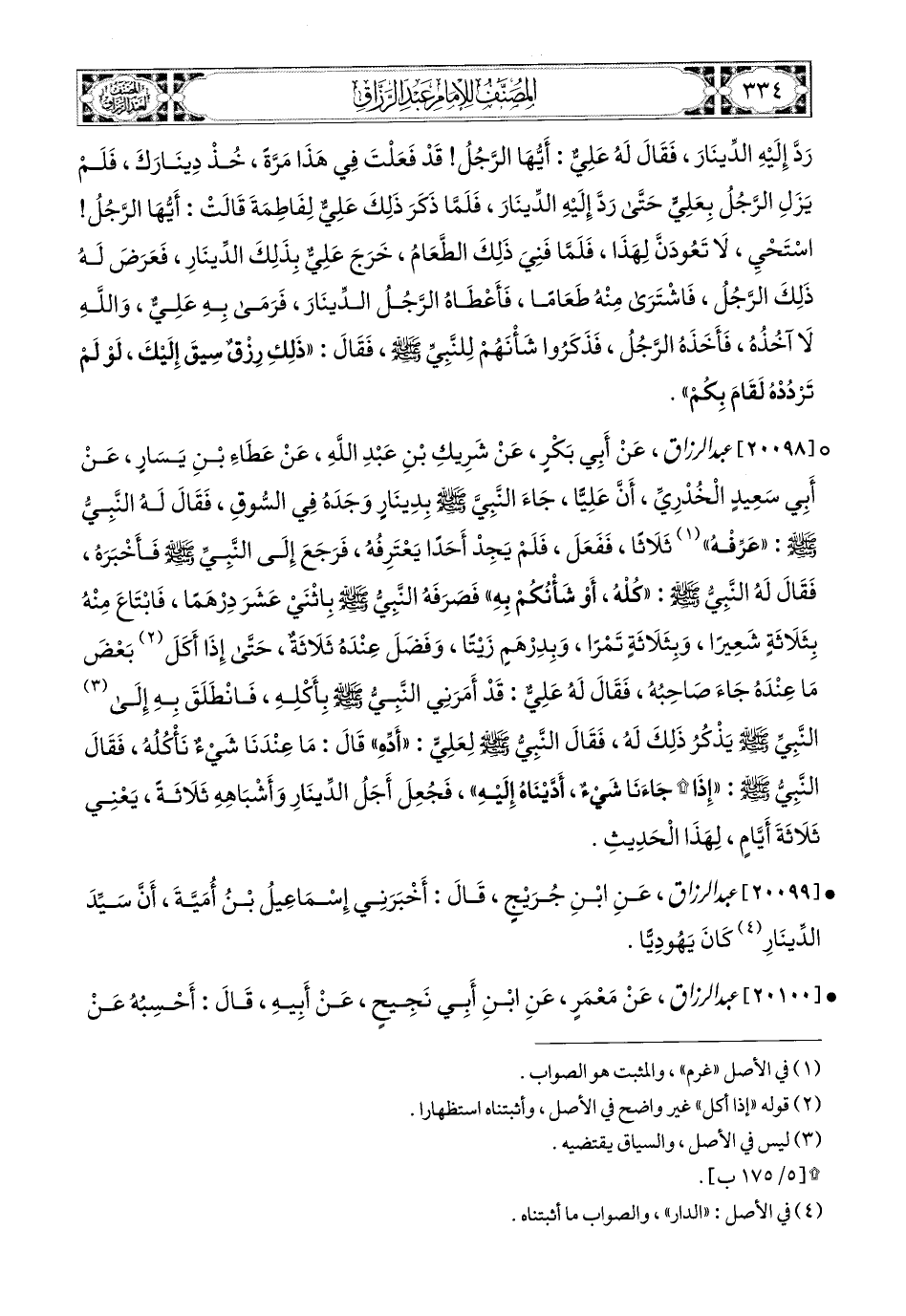 20098- عبد الرزاق، عَنْ أَبِي بَكْرٍ، عَن شَرِيكِ بْنِ عَبدِ اللهِ، عَنْ عَطَاءِ بْنِ يَسَارٍ، عَنْ أَبِي سَعيدٍ الْخُدْرِيِّ؛ أَنَّ عَلِيًّا جَاءَ النَّبِيَّ صَلَّى اللهُ عَلَيْهِ وَسَلَّمَ بِدِينَارٍ وَجَدَهُ فِي السُّوقِ، فَقَالَ لَهُ النَّبِيُّ صَلَّى اللهُ عَلَيْهِ وَسَلَّمَ: عَرِّفْ ثَلاَثًا، فَفَعَلَ، فَلَمْ يَجِدْ أَحَدًا يَعْتَرِفُهُ، فَرَجَعَ إِلَى النَّبِيِّ صَلَّى اللهُ عَلَيْهِ وَسَلَّمَ فَأَخْبَرَهُ، فَقَالَ لَهُ النَّبِيُّ صَلَّى اللهُ عَلَيْهِ وَسَلَّمَ: كُلْهُ، أَوْ شَأْنُكُمْ بِهِ، فَصَرَفَهُ النَّبِيُّ صَلَّى اللهُ عَلَيْهِ وَسَلَّمَ بِاثْنَيْ عَشَرَ دِرْهَمًا، فَابْتَاعَ مِنْهُ بِثَلاَثَةٍ شَعِيرًا، وَبِثَلاَثَةٍ تَمْرًا، وَبِدِرْهَمٍ زَيْتًا، وَفَضَلَ عِنْدَهُ ثَلاَثَةٌ، حَتَّى إِذَا أَكَلَ بَعْضَ مَا عِنْدَهُ، جَاءَ صَاحِبُهُ، فَقَالَ لَهُ عَلِيٌّ: قَدْ أَمَرَنِي النَّبِيُّ صَلَّى اللهُ عَلَيْهِ وَسَلَّمَ بِأَكْلِهِ، فَانْطَلَقَ بِهِ إِلَى النَّبِيِّ صَلَّى اللهُ عَلَيْهِ وَسَلَّمَ يَذْكُرُ ذَلِكَ لَهُ، فَقَالَ النَّبِيُّ صَلَّى اللهُ عَلَيْهِ وَسَلَّمَ لِعَلِيٍّ: أَدِّهِ، قَالَ: مَا عِنْدَنَا شَيْءٌ نَأْكُلُهُ، فَقَالَ النَّبِيُّ صَلَّى اللهُ عَلَيْهِ وَسَلَّمَ: إِذَا جَاءَنَا شَيْءٌ أَدَّيْنَاهُ إِلَيْهِ، فَجَعَلَ أَجَلَ الدِّينَارِ وَأَشْبَاهِهِ ثَلاَثَةً، يَعْنِي ثَلاَثَةَ أَيَّامٍ، لِهَذَا الْحَدِيثِ.