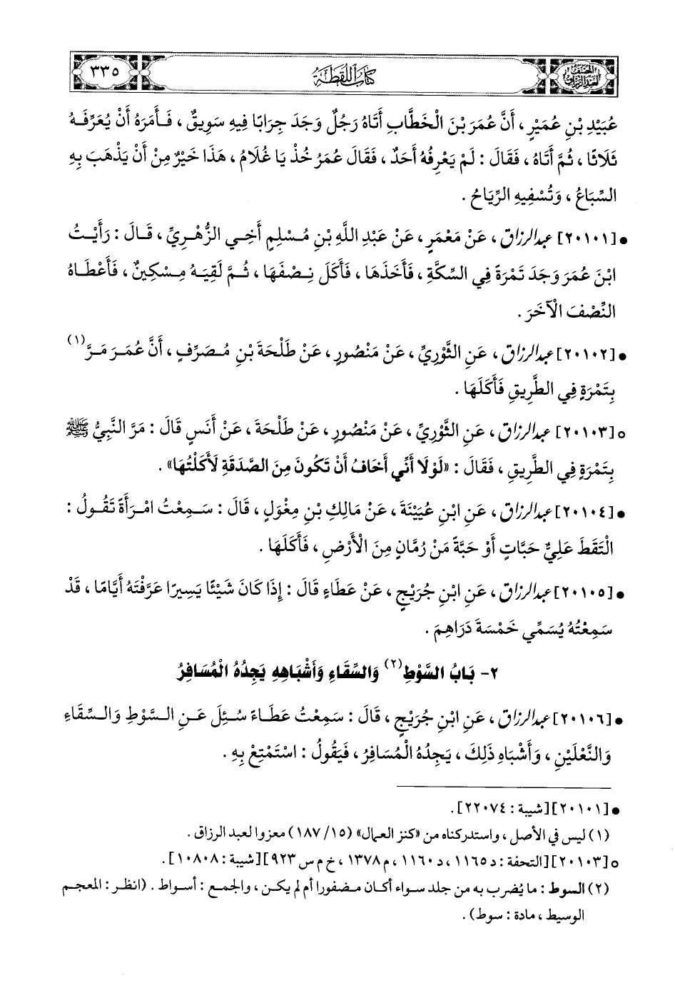 20101- عبد الرزاق، عَنْ مَعْمَرٍ، عَنْ عَبدِ اللهِ بْنِ مُسْلِمٍ، أَخِي الزُّهْرِيِّ، قَالَ: رَأَيْتُ ابْنَ عُمَرَ وَجَدَ تَمْرَةً فِي السِّكَّةِ، فَأَخَذَهَا، فَأَكَلَ نِصْفَهَا، ثُمَّ لَقِيَهُ مِسْكِينٌ، فَأَعْطَاهُ النِّصْفَ الآخَرَ.
