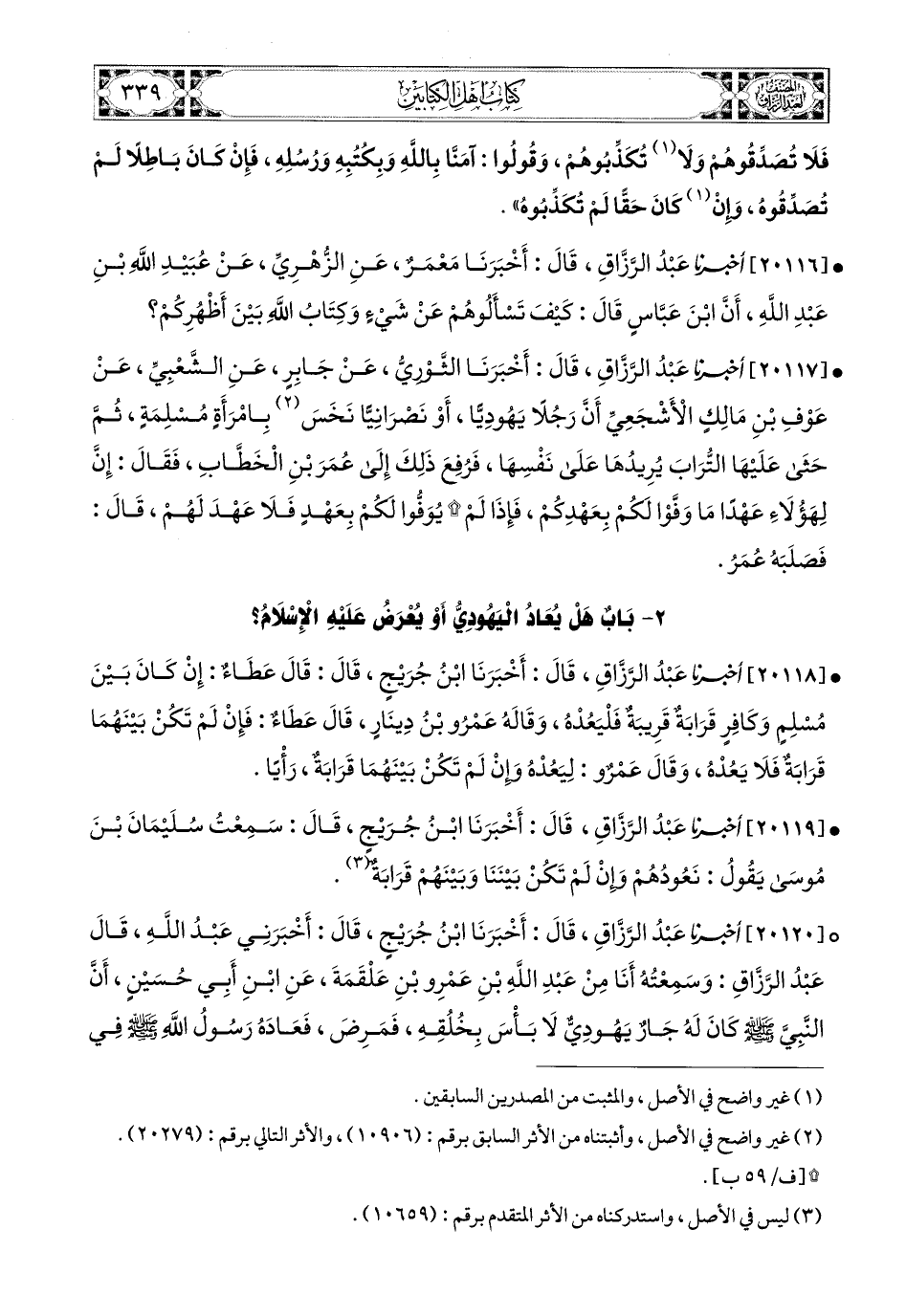 20116 - أخبرنا عبد الرزاق، قَالَ: أَخْبَرَنَا مَعْمَرٌ، عَنِ الزُّهْرِيِّ، عَن عُبَيْدِ اللهِ بْنِ عَبدِ اللهِ، أَنَّ ابْنَ عَبَّاسٍ، قَالَ: كَيْفَ تَسْأَلُوهُمْ عَن شَيْءٍ، وَكِتَابُ اللهِ بَيْنَ أَظْهُرِكُمْ.