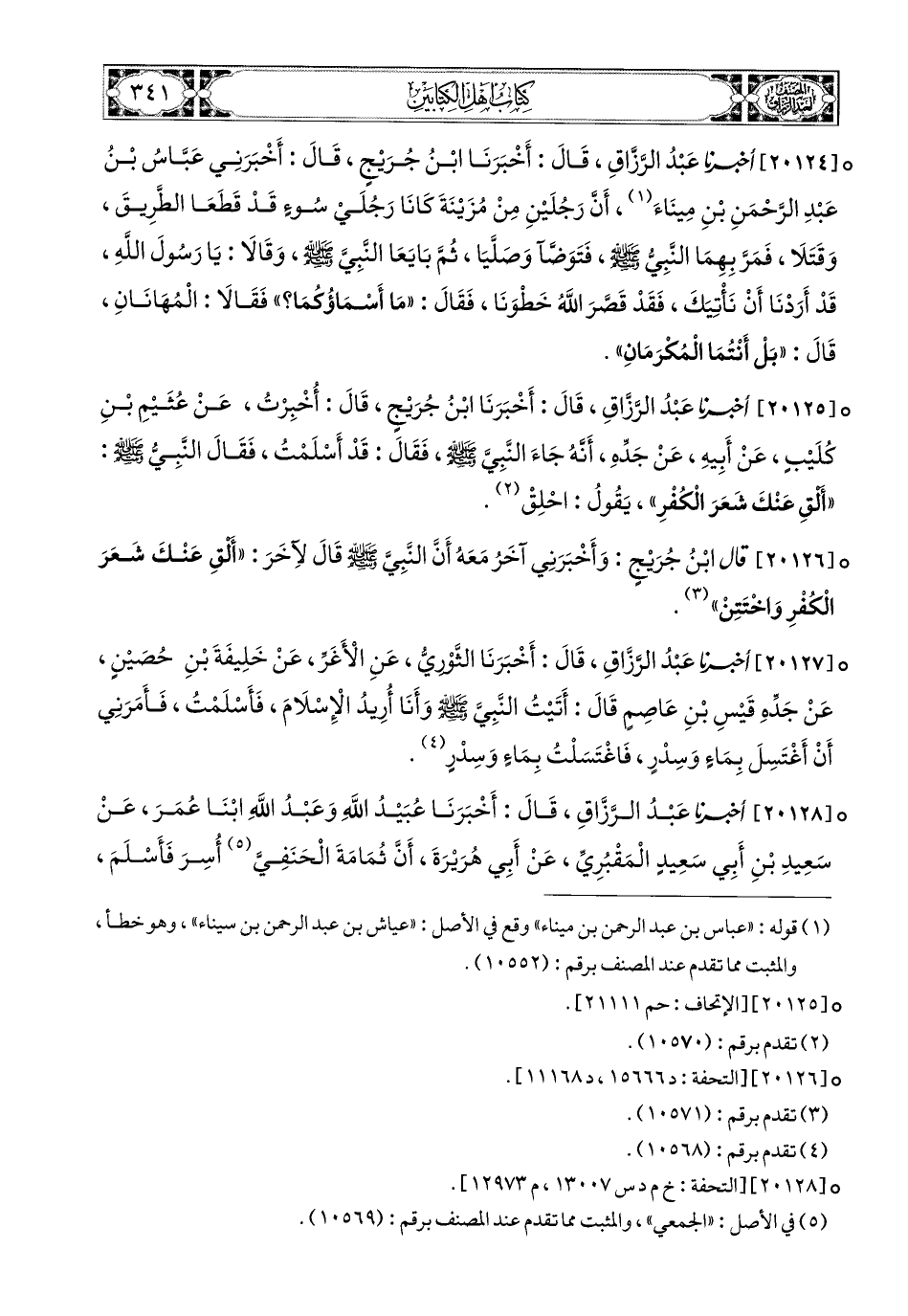 20124- أخبرنا عبد الرزاق، قَالَ: أَخْبَرَنَا ابْنُ جُرَيْجٍ، قَالَ: أَخْبَرَنِي عَبَّاسُ بن عَبدِ الرَّحْمَنِ بْنِ مِينَاءَ، أَنَّ رَجُلَيْنِ مِنْ مُزَيْنَةَ كَانَا رَجُلَيْ سَوْءٍ، قَدْ قَطَعَا الطَّرِيقَ، وَقَتَلاَ، فَمَرَّ بِهِمَا النَّبِيُّ صَلَّى اللهُ عَلَيْهِ وَسَلَّمَ، فَتَوَضَّأَ، وَصَلَّيَا، ثُمَّ بَايَعَا النَّبِيَّ صَلَّى اللهُ عَلَيْهِ وَسَلَّمَ، وَقَالاَ: يَا رَسُولَ اللهِ، قَدْ أَرَدْنَا أَنَّ نَأْتِيَكَ، فَقَدْ قَصَّرَ اللهُ خَطْوَنَا، فَقَالَ: مَا أَسْمَاؤُكُمَا؟ فَقَالاَ: المُهَانَانِ، قَالَ: بَلْ أَنْتُمَا المُكْرَمَانِ.