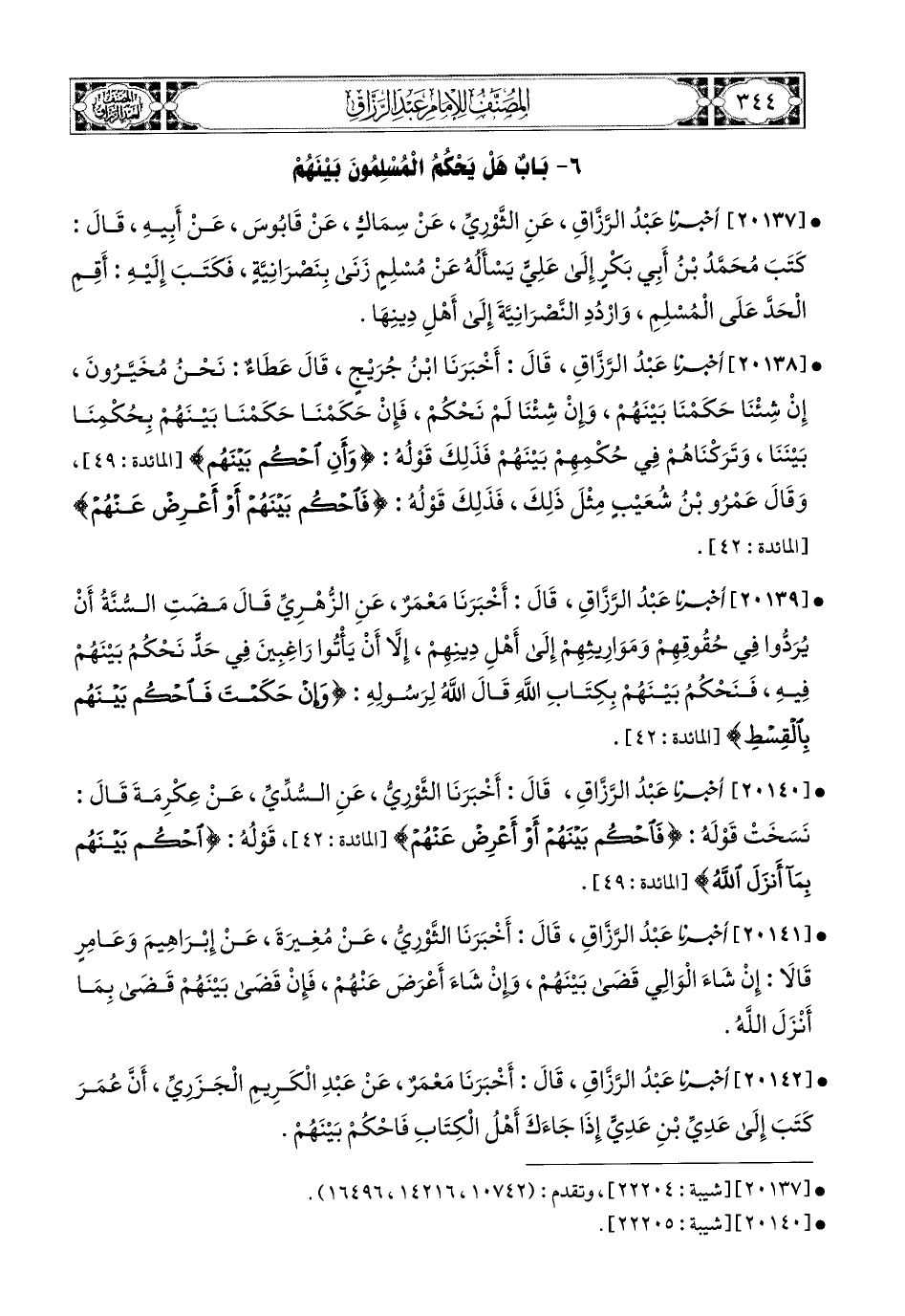20138- أخبرنا عبد الرزاق، قَالَ: أَخْبَرَنَا ابْنُ جُرَيْجٍ، قَالَ عَطَاءٌ: نَحْنُ مُخَيَّرُونَ، إِنْ شِئْنَا حَكَمْنَا بَيْنَهُمْ، وَإِنْ شِئْنَا لَمْ نَحْكُمْ، فَإِنْ حَكَمْنَا، حَكَمْنَا بَيْنَهُمْ بِحُكْمِنَا بَيْنَنَا، وَتَرَكْنَاهُمْ فِي حُكْمِهِمْ بَيْنَهُمْ، فَذَلِكَ قَوْلُهُ: {وَأَنِ احْكُمْ بَيْنَهُمْ} وَقَالَ عَمْرُو بن شُعَيْبٍ مِثْلَ ذَلِكَ، فَذَلِكَ قَوْلُهُ: {فَاحْكُمْ بَيْنَهُمْ أَوْ أَعْرِضْ عَنْهُمْ}.