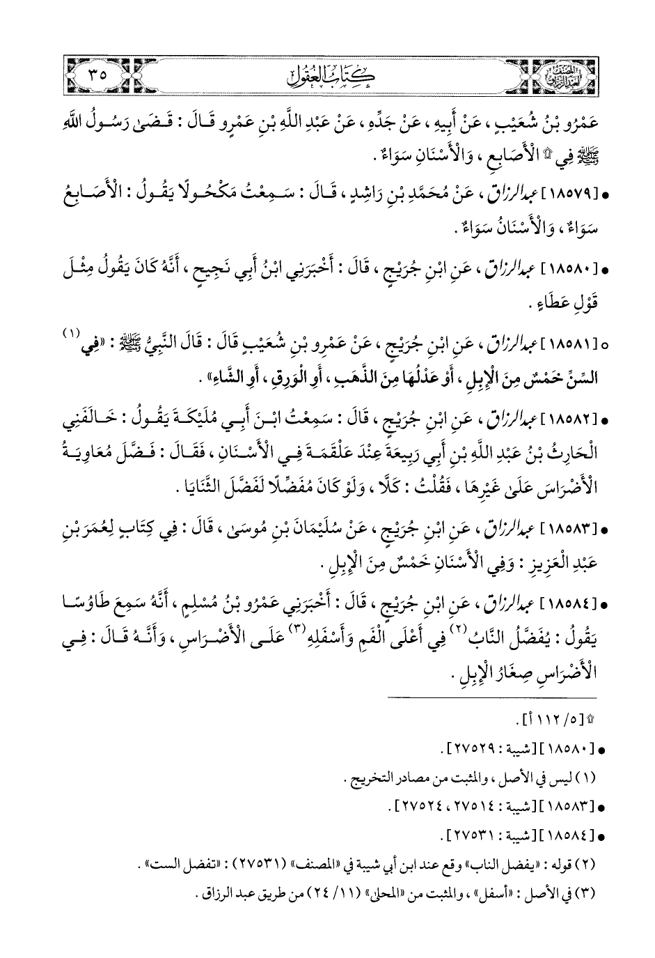 18581- عبد الرزاق، عَنِ ابْنِ جُرَيْجٍ، عَنْ عَمْرِو بنِ شُعَيْبٍ قَالَ: قَالَ النَّبِيُّ صَلَّى اللهُ عَلَيْهِ وَسَلَّمَ: فِي السِّنِّ خَمْسٌ مِنَ الإِبِلِ، أَوْ عَدْلُهَا مِنَ الذَّهَبِ، أَوِ الْوَرِقِ، أَوِ الشَّاءِ.