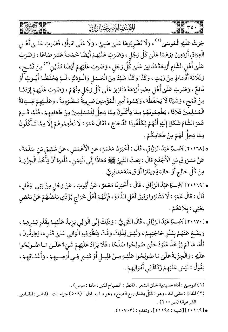 20170- أخبرنا عبد الرزاق، قَالَ الثَّورِيُّ: وَذَلِكَ إِلَى الْوَالِي يَزِيدُ عَلَيْهِمْ بِقَدْرِ يُسْرِهِمْ، وَيَضَعُ عَنْهُمْ بِقَدْرِ حَاجَتِهِمْ، وَلَيْسَ لِذَلِكَ وَقْتٌ، يَنْظُرُ فِيهِ الْوَالِي عَلَى قَدْرِ مَا يُطِيقُونَ، فَأَمَّا مَا لَمْ يُؤْخَذْ عَنْوَةً، حَتَّى صُولِحُوا صُلْحًا، فَلاَ يُزَادُ عَلَيْهِمْ شَيْءٌ عَلَى مَا صُولِحُوا عَلَيْهِ، وَالْجِزْيَةُ عَلَى مَا صُولِحُوا عَلَيْهِ مِنْ قَلِيلٍ، أَوْ كَثِيرٍ فِي أَرَضِيهِمْ، وَأَعْنَاقِهِمْ، يَقُولُ: لَيْسَ عَلَيْهِمْ زَكَاةٌ فِي أَمْوَالِهِمْ.