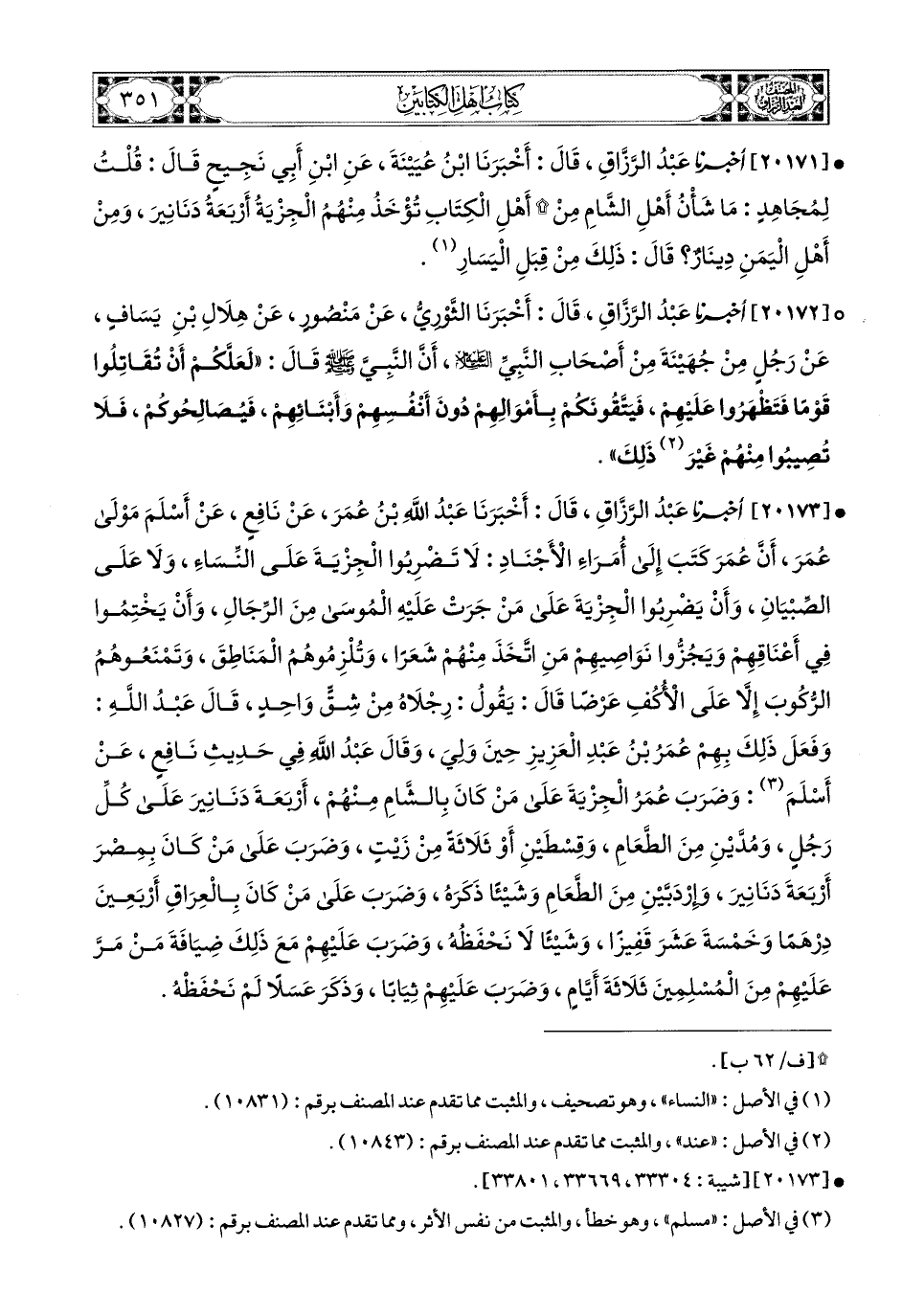 20173- أخبرنا عبد الرزاق، قَالَ: أَخْبَرَنَا عَبدُ اللهِ بن عُمَرَ، عَن نَافِعٍ، عَنْ أَسْلَمَ، مَوْلَى عُمَرَ، أَنَّ عُمَرَ كَتَبَ إِلَى أُمَرَاءِ الأَجْنَادِ: لاَ تَضْرِبُوا الْجِزْيَةَ عَلَى النِّسَاءِ، وَلاَ عَلَى الصِّبْيَانِ، وَأَنْ يَضْرِبُوا الْجِزْيَةَ عَلَى مِنْ جَرَتْ عَلَيْهِ المُوسَى مِنَ الرِّجَالِ، وَأَنْ يَخْتِمُوا فِي أَعْنَاقِهِمْ، وَيَجُزُّوا نَوَاصِيَهُمْ، مَنِ اتَّخَذَ مِنْهُمْ شَعَرًا، وَتُلْزِمُوهُمُ المَنَاطِقَ، وَتَمْنَعُوهُمُ الرُّكُوبَ إِلَّا عَلَى الأُكُفِ عَرْضًا، قَالَ: يَقُولُ: رِجْلاَهُ مِنْ شِقٍّ وَاحِدٍ، قَالَ عَبدُ اللهِ: وَفَعَلَ ذَلِكَ بِهِمْ عُمَرُ بن عَبدِ الْعَزِيزِ حِينَ وَلِيَ، وَقَالَ عَبدُ اللهِ فِي حَدِيثِ نَافِعٍ، عَنْ أَسْلَمَ: وَضَرَبَ عُمَرُ الْجِزْيَةَ عَلَى مَنْ كَانَ بِالشَّامِ مِنْهُمْ أَرْبَعَةَ دَنَانِيرَ عَلَى كُلِّ رَجُلٍ، وَمُدَّيْنِ مِنَ الطَّعَامِ، وَقِسْطَيْنِ، أَوْ ثَلاَثَةٍ مِنْ زَيْتٍ، وَضَرَبَ عَلَى مَنْ كَانَ بِمِصْرَ أَرْبَعَةَ دَنَانِيرَ، وَإِرْدَبَّيْنِ مِنَ الطَّعَامِ، وَشَيْئًا ذَكَرَهُ، وَضَرَبَ عَلَى مَنْ كَانَ بِالْعِرَاقِ أَرْبَعِينَ دِرْهَمًا، وَخَمْسَةَ عَشَرَ قَفِيزًا، وَشَيْئًا لاَ نَحْفَظُهُ، وَضَرَبَ عَلَيْهِمْ مَعَ ذَلِكَ ضِيَافَةَ مِنْ مَرَّ عَلَيْهِمْ مِنَ المُسْلِمِينَ ثَلاَثَةَ أَيَّامٍ، وَضَرَبَ عَلَيْهِمْ ثِيَابًا، وَذَكَرَ عَسَلاً لَمْ نَحْفَظْهُ.