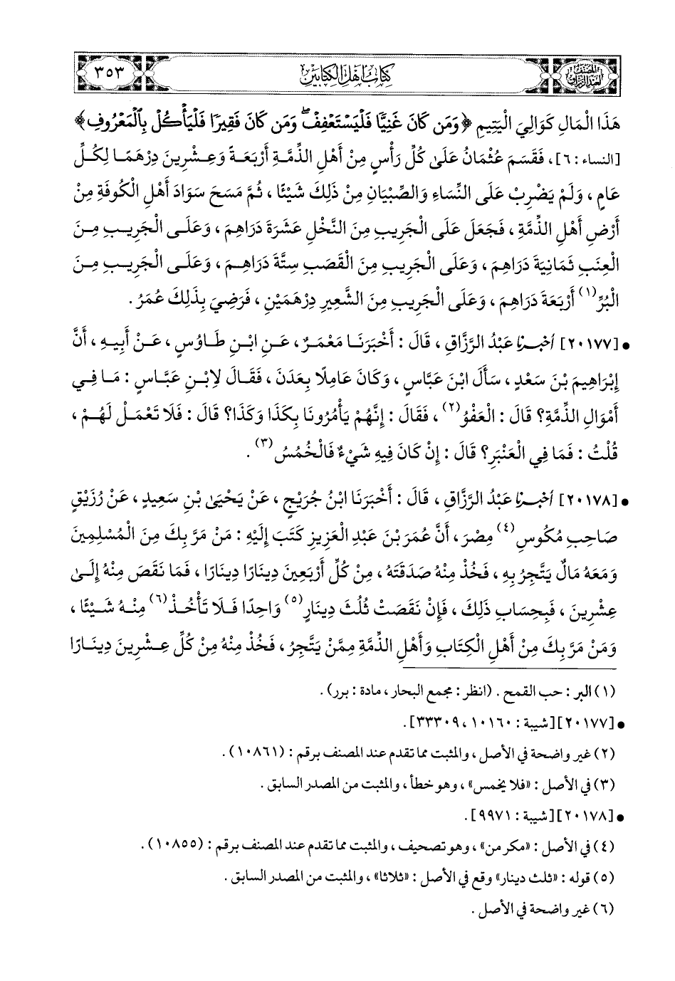 20178- أخبرنا عبد الرزاق، قَالَ: أَخْبَرَنَا ابْنُ جُرَيْجٍ، عَن يَحيَى بنِ سَعيدٍ، عَن رُزَيْقٍ، صَاحِبِ مُكُوسِ مِصْرَ، أَنَّ عُمَرَ بن عَبدِ الْعَزِيزِ كَتَبَ إِلَيْهِ: مَنْ مَرَّ بِكَ مِنَ المُسْلِمِينَ وَمَعَهُ مَالٌ يَتَّجِرُ بِهِ، فَخُذْ مِنْهُ صَدَقَتَهُ، مِنْ كُلِّ أَرْبَعِينَ دِينَارًا دِينَارًا، فَمَا نَقَصَ مِنْهُ إِلَى عِشْرِينَ، فَبِحِسَابِ ذَلِكَ، فَإِنْ نَقَصَت ثُلُثَ دِينَارٍ وَاحدًا (1) فَلاَ تَأْخُذْ مِنْهُ شَيْئًا، وَمَنْ مَرَّ بِكَ مِنْ أَهْلِ الْكِتَابِ وَأَهْلِ الذِّمَّةِ مِمَّنْ يَتَّجِرُ، فَخُذْ مِنْهُ مِنْ كُلِّ عِشْرِينَ دِينَارًا دِينَارًا، فَمَا نَقَصَ، فَبِحِسَابِ ذَلِكَ إِلَى عَشَرَةِ دَنَانِيرَ، فَإِنْ نَقَصَ ثُلُثُ دِينَارٍ، فَلاَ تَأْخُذْ مِنْهُ شَيْئًا.
