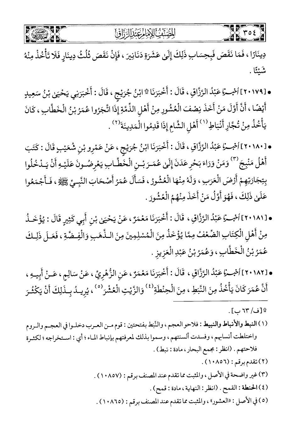20180- أخبرنا عبد الرزاق، قَالَ: أَخْبَرَنَا ابْنُ جُرَيْجٍ، عَنْ عَمْرِو بنِ شُعَيْبٍ، قَالَ: كَتَبَ أَهْلُ مَنْبِجَ وَمَنْ وَرَاءَ بَحْرِ عَدَنَ إِلَى عُمَرَ بْنِ الْخَطَّابِ يَعْرِضُونَ عَلَيْهِ أَنْ يَدْخُلُوا بِتِجَارَتِهِمْ (1) أَرْضَ الْعَرَبِ، وَلَهُ مِنْهَا الْعُشُورُ، فَسَأَلَ عُمَرُ أَصْحَابَ النَّبِيِّ صَلَّى اللهُ عَلَيْهِ وَسَلَّمَ، فَأَجْمِعُوا عَلَى ذَلِكَ، فَهُوَ أَوَّلُ مِنْ أَخَذَ مِنْهُمُ الْعُشُورَ.