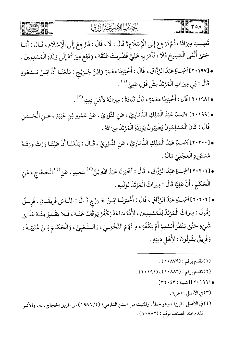 20202- أخبرنا عبد الرزاق، قَالَ: أَخْبَرَنَا ابْنُ جُرَيْجٍ، قَالَ: النَّاسُ فَرِيقَانِ، فَرِيقٌ يَقُولُ: مِيرَاثُ المُرْتَدِّ لِلْمُسْلِمِينَ، لأَنَّهُ سَاعَةَ يَكْفُرُ يُوقَفُ عَنْهُ، فَلاَ يُقْدَرُ مِنْهُ عَلَى شَيْءٍ، حَتَّى يُنْظَرَ أَيُسْلِمُ أَمْ يَكْفُرُ مِنْهُمُ النَّخَعِيُّ، وَالشَّعْبِيُّ، وَالْحَكَمُ بن عُتَيْبَةَ وَفَرِيقٌ يَقُولُونَ لأَهْلِ دِينِهِ.