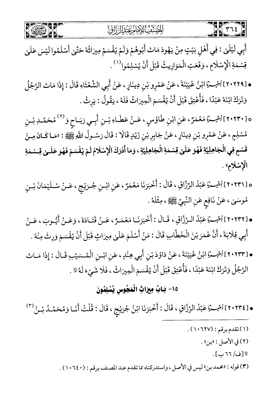 20230- أَخْبَرَنَا مَعْمَرٌ، عَنِ ابْنِ طَاوُوسٍ، عَنْ عَطَاءِ بْنِ أَبِي رَبَاحٍ، وَمُحَمَّدِ بْنِ مُسْلِمٍ، عَنْ عَمْرِو بنِ دِينَارٍ، عَن جَابِرِ بْنِ زَيْدٍ، قَالاَ: قَالَ رَسُولُ اللهِ صَلَّى اللهُ عَلَيْهِ وَسَلَّمَ: مَا كَانَ مِنْ قَسْمٍ فِي الْجَاهِلِيَّةِ فَهُو عَلَى قِسْمَةِ الْجَاهِلِيَّةِ، وَمَا أَدْرَكَ الإِسْلاَمُ لَمْ يُقْسَمْ فَهُو عَلَى قِسْمَةِ الإِسْلاَمِ.