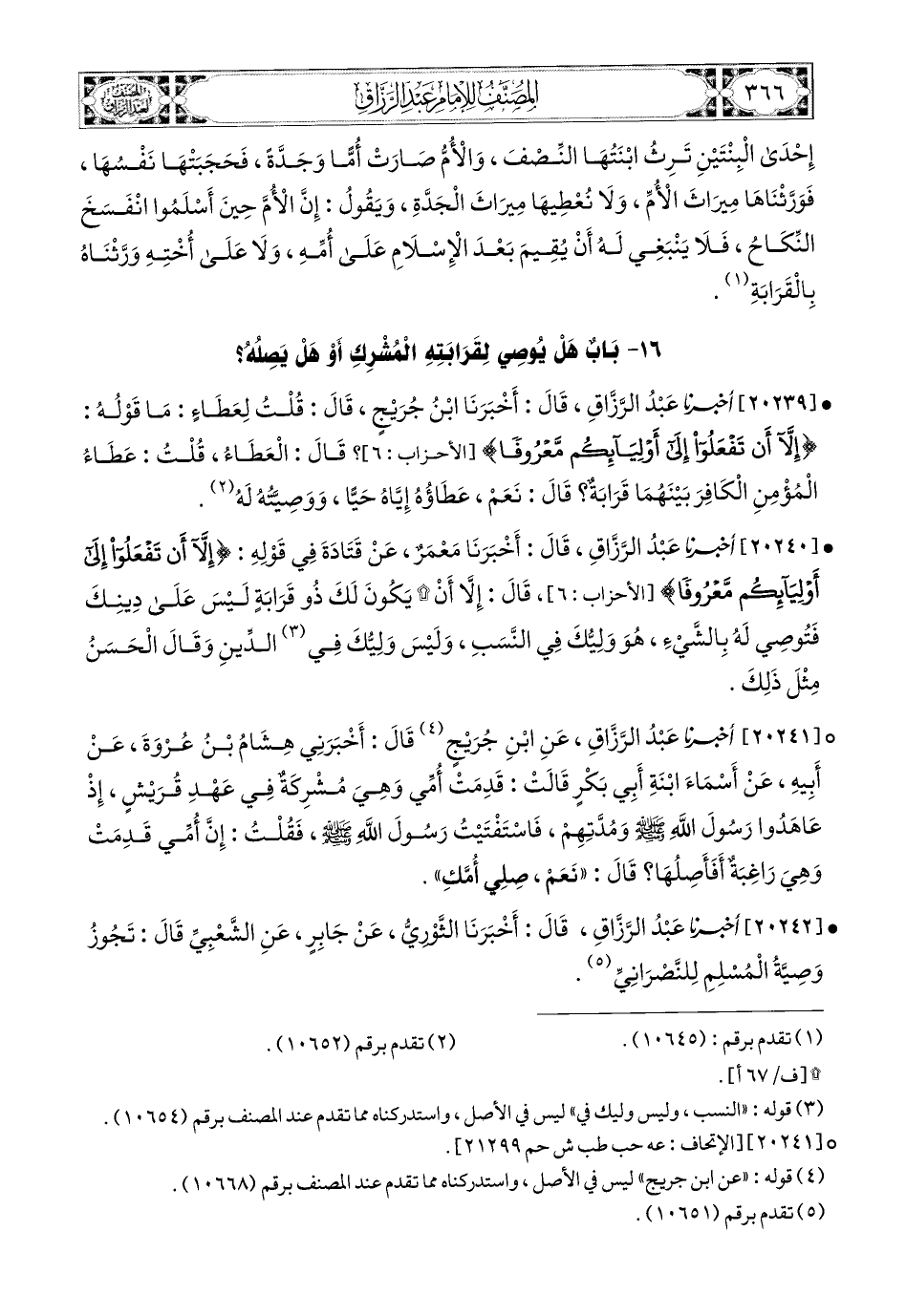 20240- أخبرنا عبد الرزاق، قَالَ: أَخْبَرَنَا مَعْمَرٌ، عَن قَتَادَةَ، فِي قَوْلِهِ: {إِلاَّ أَنْ تَفْعَلُوا إِلَى أَوْلِيَائِكُمْ مَعْرُوفًا}، قَالَ: إِلاَّ أَنْ يَكُونَ لَكَ ذُو قَرَابَةٍ لَيْسَ عَلَى دِينِكَ فَتُوصِي لَهُ بِالشَّيْءِ هُوَ وَلِيُّكَ فِي النَّسَبِ، وَلَيْسَ وَلِيُّكَ فِي الدِّينِ، وَقَالَ الْحَسَنُ مِثْلَ ذَلِكَ.