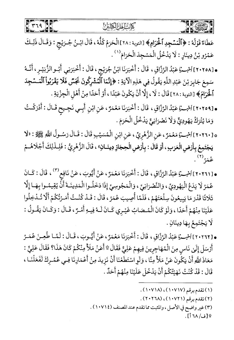 20259- أخبرنا عبد الرزاق، قَالَ: أَخْبَرَنَا مَعْمَرٌ، عَنِ ابْنِ أَبِي نَجِيحٍ قَالَ: أَدْرَكْتُ وَمَا يُتْرَكُ يَهُودِيٌّ وَلاَ نَصْرَانِيٌّ يَدْخُلُ الْحَرَمَ.