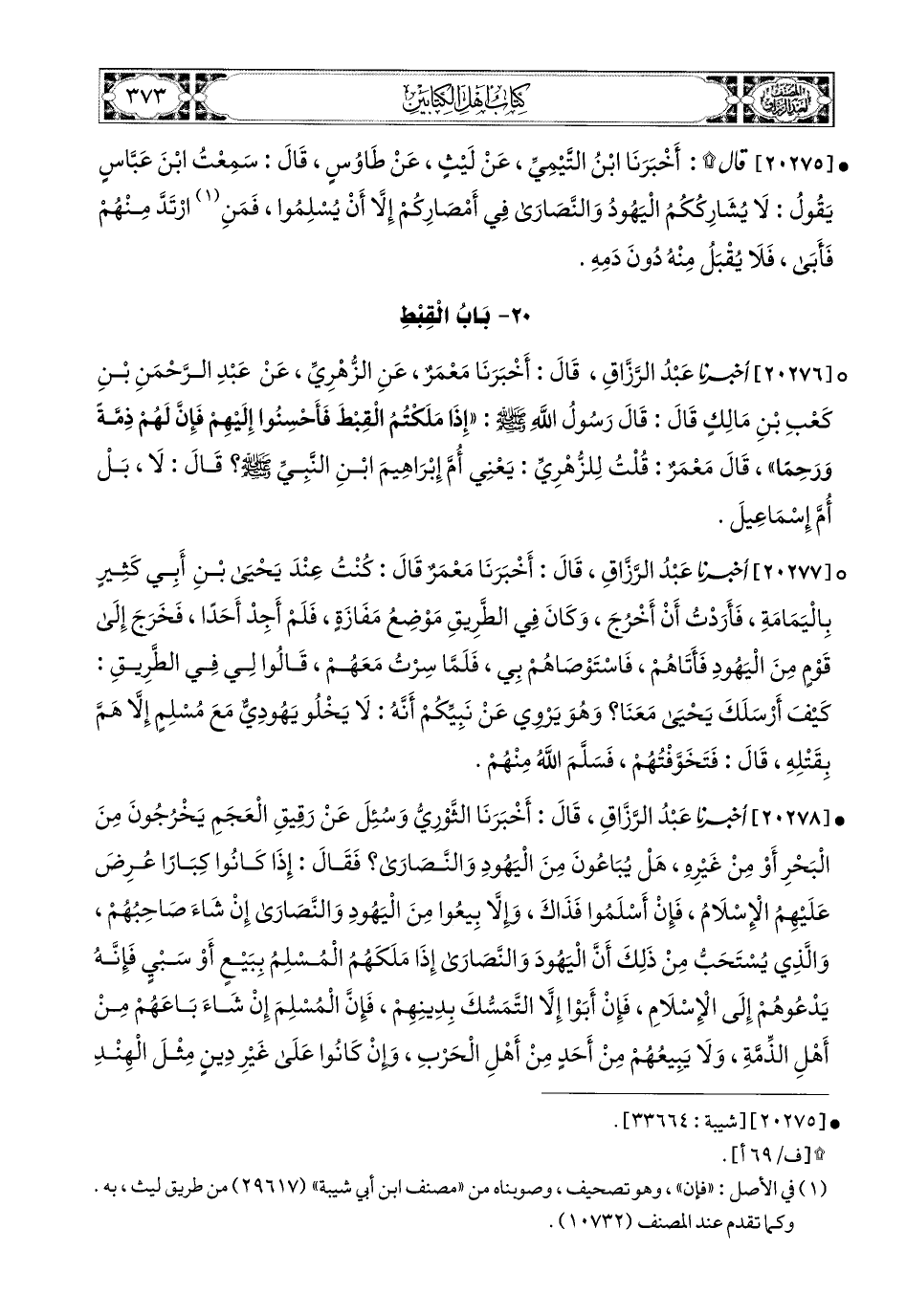 20275- قَالَ: أَخْبَرَنَا ابْنُ التَّيْمِيِّ، عَن لَيْثٍ، عَن طَاوُوسٍ، قَالَ: سَمِعْتُ ابْنَ عَبَّاسٍ يَقُولُ: لاَ يُشارِكُكُمُ الْيَهُودُ وَالنَّصَارَى فِي أَمْصَارِكُمْ، إِلاَّ أَنْ يُسْلِمُوا، فَمَنِ ارْتَدَّ مِنْهُمْ، فَأَبَى، فَلاَ يُقْبَلُ مِنْهُ دُونَ دَمِهِ.