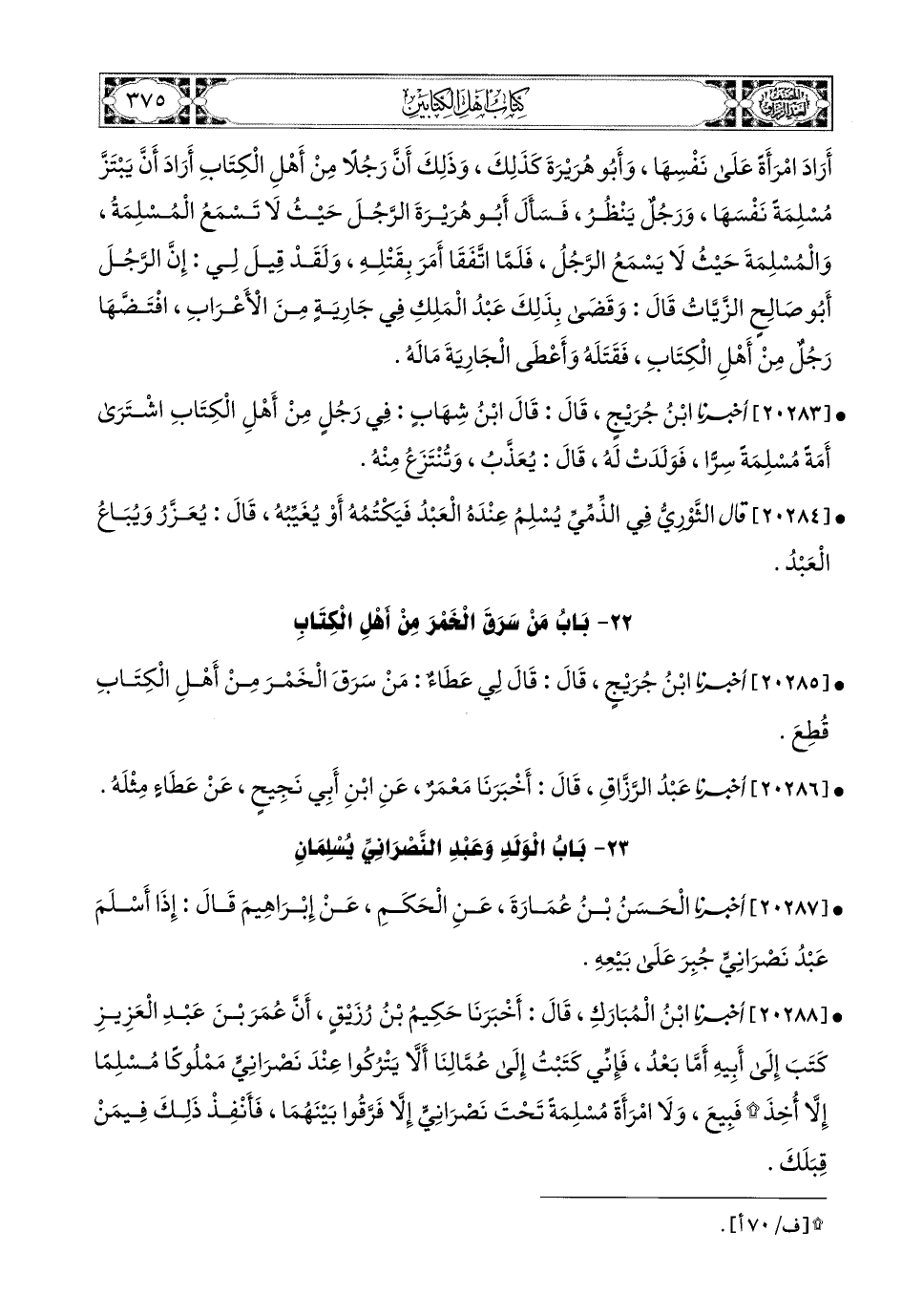 20288- أَخْبَرَنَا ابْنُ المُبَارَكِ، قَالَ: أَخْبَرَنَا حَكِيمُ بن رُزَيْقٍ، أَنَّ عُمَرَ بن عَبدِ الْعَزِيزِ كَتَبَ إِلَى أَبِيهِ: أَمَّا بَعْدُ، فَإِنِّي كَتَبْتُ إِلَى عُمَّالِنَا أَلاَّ يَتْرُكُوا عِنْدَ نَصْرَانِيٍّ مَمْلُوكًا مُسْلِمًا، إِلاَّ أُخِذَ فَبِيعَ، وَلاَ امْرَأَةً مُسْلِمَةً تَحْتَ نَصْرَانِيٍّ إِلاَّ فَرَّقُوا بَيْنَهُمَا، فَأَنْفِذْ ذَلِكَ فِيمَنْ قِبَلَكَ.