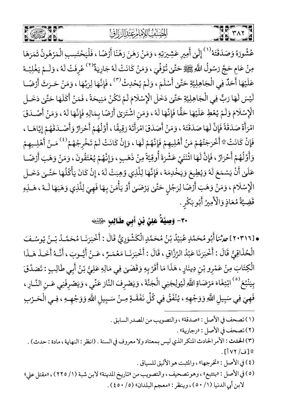 20316- حَدَّثناَ أَبو مُحَمَّدٍ عُبَيْدُ بن مُحَمَّدٍ الْكَشْوَرِيُّ، قَالَ: أَخْبَرَنَا مُحَمَّدُ بن يُوسُفَ الْحُذَاقِيُّ، قَالَ: أَخْبَرَنَا عَبدُ الرَّزَّاقِ، قَالَ: أَخْبَرَنَا مَعْمَرٌ، عَنْ أَيُّوبَ، أَنَّهُ أَخَذَ هَذَا الْكِتَابَ مِنْ عَمْرِو بنِ دِينَارٍ، هَذَا مَا أَقَرَّ بِهِ وَقَضَى فِي مَالِهِ عَلِيُّ بن أَبِي طَالِبٍ: تَصَدَّقَ بِيَنْبُعَ ابْتِغَاءَ مَرْضَاةِ اللهِ، لِيُولِجَنِي الْجَنَّةَ، وَيَصْرِفَ النَّارَ عَنِّي، وَيَصْرِفَنِي عَنِ النَّارِ، فَهِيَ فِي سَبِيلِ اللهِ وَوَجْهِهِ، يُنْفَقُ فِي كُلِّ نَفَقَةٍ مِنْ سَبِيلِ اللهِ وَوَجْهِهِ، فِي الْحَرْبِ وَالسِّلْمِ، وَالْخَيْرِ وَذَوِي الرَّحِمِ، وَالْقَرِيبِ، وَالْبَعِيدِ، لاَ يُبَاعُ، وَلاَ يُوهَبُ، وَلاَ يُورَثُ، كُلُّ مَالٍ فِي يَنْبُعَ، غَيْرَ أَنَّ رَبَاحًا، وَأَبَا نَيْزَرٍ، وَجُبَيرًا إِنْ حَدَثَ بِي حَدَثٌ، لَيْسَ عَلَيْهِمْ سَبِيلٌ، وَهُمْ مُحَرَّرُونَ مَوَالٍ، يَعْمَلُونَ فِي المَالِ خَمْسَ حِجَجٍ، وَفِيهِ نَفَقَاتُهُمْ وَرِزْقُهُمْ، وَرِزْقُ أَهْلِيهِمْ، فَذَلِكَ الَّذِي أَقْضِي فِيمَا كَانَ لِي فِي يَنْبُعَ جَانِبِهِ، حَيًّا أَنَا أَوْ مَيِّتًا، وَمَعَهَا مَا كَانَ لِي بِوَادِي الْقُرَى مِنْ مَالٍ وَرَقِيقٍ، حَيًّا أَنَا أَوْ مَيِّتًا، وَمَعَ ذَلِكَ الأُذَيْنَةُ وَأَهْلُهَا، حَيًّا أَنَا أَوْ مَيِّتًا، وَمَعَ ذَلِكَ رَعْدٌ وَأَهْلُهَا، غَيْرَ أَنَّ زُرَيْقًا مِثْلُ مَا كَتَبْتُ لأَبِي نَيْزَرٍ، وَرَبَاحٍ، وَجُبَيرٍ، وَأَنَّ يَنْبُعَ وَمَا فِي وَادِي الْقُرَى وَالأُذَيْنَةِ وَرَعْدٍ يُنْفَقُ فِي كُلِّ نَفَقَةٍ ابْتِغَاءَ وَجْهِ اللهِ وَفِي سَبِيلِهِ، يَوْمَ تَسْوَدُّ وُجُوهٌ وَتَبْيَضُّ وُجُوهٌ، لاَ يُبَعْنَ، وَلاَ يُوهَبْنَ، وَلاَ يُورَّثْنَ إِلاَّ إِلَى اللهِ، هُوَ يَتَقَبَّلَهُنَّ وَهُو يَرِثُهُنَّ، فَذَلِكَ قَضِيَّةٌ بَيْنِي وَبَيْنَ اللهِ الغدَ مِنْ يَوْمِ قَدِمْتُ مَسْكَنَ، حَيًّا أَنَا أَوْ مَيِّتًا، فَهَذَا مَا قَضَى عَلِيٌّ فِي مَالِهِ وَاجِبَةً بَتْلَةً،