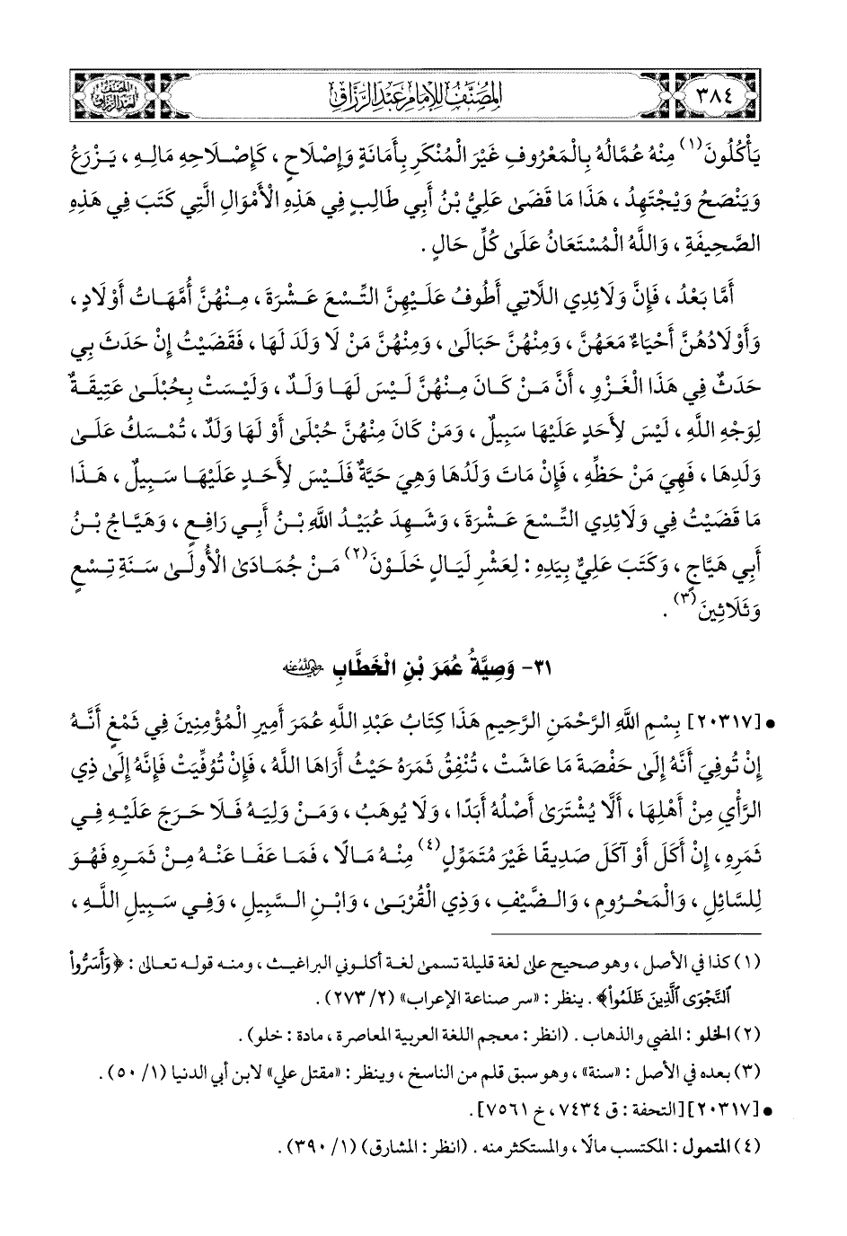 20317- بِسْمِ اللهِ الرَّحْمَنِ الرَّحِيمِ، هَذَا كِتَابُ عَبدِ اللهِ عُمَرَ أَمِيرِ المُؤْمِنِينَ فِي ثَمْغٍ، أَنَّهُ إِنْ تُوُفِّيَ، أَنَّهُ إِلَى حَفْصَةَ مَا عَاشَتْ، تُنْفِقُ ثَمَرَهُ حَيْثُ أَرَاهَا اللهُ، فَإِنْ تُوُفِّيَتْ، فَإِنَّهُ إِلَى ذِي الرَّأْيِ مِنْ أَهْلِهَا، أَلاَّ يُشْتَرَى أَصْلَهُ أَبَدًا، وَلاَ يُوهَبَ، وَمَنْ وَلِيَهُ، فَلاَ حَرَجَ عَلَيْهِ فِي ثَمَرِهِ، إِنْ أَكَلَ، أَوْ آكَلَ صَدِيقًا، غَيْرَ مُتَمَوِّلٍ مِنْهُ مَالاً، فَمَا عَفَا عَنْهُ مِنْ ثَمَرِهِ، فَهُو لِلسَّائِلِ، وَالمَحْرُومِ، وَالضَيفِ، وَذِي الْقُرْبَى، وَابْنِ السَّبِيلِ، وَفِي سَبِيلِ اللهِ، تُنْفِقُهُ حَيْثُ أَرَاهَا اللهُ مِنْ ذَلِكَ، فَإِنْ تُوُفِّيَتْ فَإِلَى ذِي الرَّأْيِ مِنْ وَلَدِي، وَمِئَةُ الْوَسْقِ الَّذِي أَطْعَمَنِي مُحَمَّدٌ صَلَّى اللهُ عَلَيْهِ وَسَلَّمَ بِالْوَادِي بِيَدِي، لَمْ أُهْلِكْهَا، فَإِنَّهَا مَعَ ثَمْغٍ عَلَى السُّنَّةِ الَّتِي أَمَرْتُ بِهَا، وَإِنْ شَاءَ وَلِيُّ ثَمْغٍ اشْتَرَى مِنْ ثَمَرِهِ رَقِيقًا لِعَمَلِهِ، وَكَتَبَ مُعَيْقِيبٌ، وَشَهِدَ عَبدُ اللهِ بن الأَرْقَمِ.