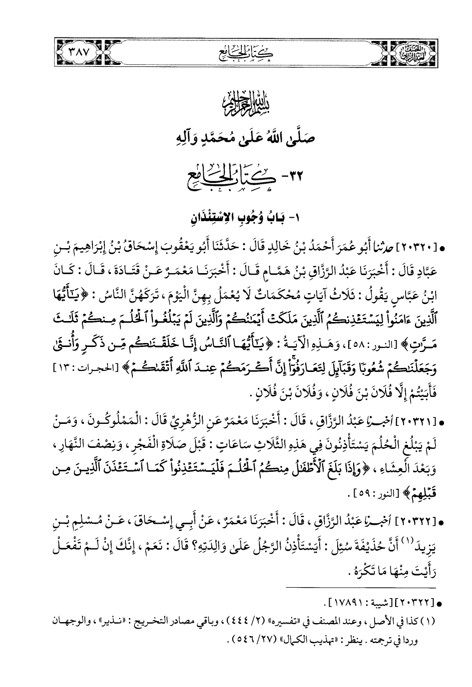 20321- أخبرنا عبد الرزاق، قَالَ: أَخْبَرَنَا مَعْمَرٌ، عَنِ الزُّهْرِيِّ، قَالَ: المَمْلُوكُونَ، وَمَنْ لَمْ يَبْلُغِ الْحُلُمَ يَسْتَأْذِنُونَ فِي هَذِهِ الثَّلاَثِ سَاعَاتٍ: قَبْلَ صَلاَةِ الْفَجْرِ، وَنِصْفِ النَّهَارِ، وَبَعْدَ الْعِشَاءِ: {وَإِذَا بَلَغَ الأَطْفَالُ مِنْكُمُ الْحُلُمَ فَلْيَسْتَأْذِنُوا كَمَا اسْتَأْذَنَ الَّذِينَ مِنْ قَبْلِهِمْ}.