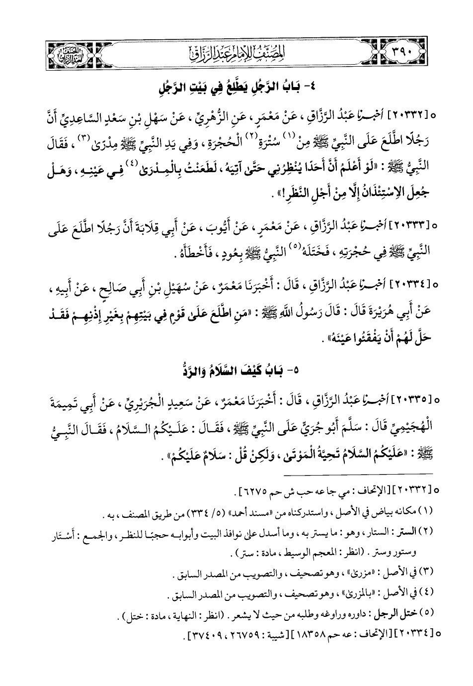 20332- أخبرنا عبد الرزاق، عَنْ مَعْمَرٍ، عَنِ الزُّهْرِيِّ، عَن سَهْلِ بْنِ سَعْدٍ السَّاعِدِيِّ، أَنَّ رَجُلاً اطَّلَعَ عَلَى النَّبِيِّ صَلَّى اللهُ عَلَيْهِ وَسَلَّمَ مِنْ سُتْرَةِ الْحُجْرَةِ، وَفِي يَدِ النَّبِيِّ صَلَّى اللهُ عَلَيْهِ وَسَلَّمَ مِدْرًى، فَقَالَ النَّبِيُّ صَلَّى اللهُ عَلَيْهِ وَسَلَّمَ: لَوْ أَعْلَمُ أَنَّ أَحَدًا يَنْظُرُنِي حَتَّى آتِيَهُ، لَطَعَنْتُ بِالمِدْرَى فِي عَيْنِهِ، وَهَلْ جُعِلَ الاِسْتِئْذَانُ إِلاَّ مِنْ أَجْلِ النَّظَرِ؟.