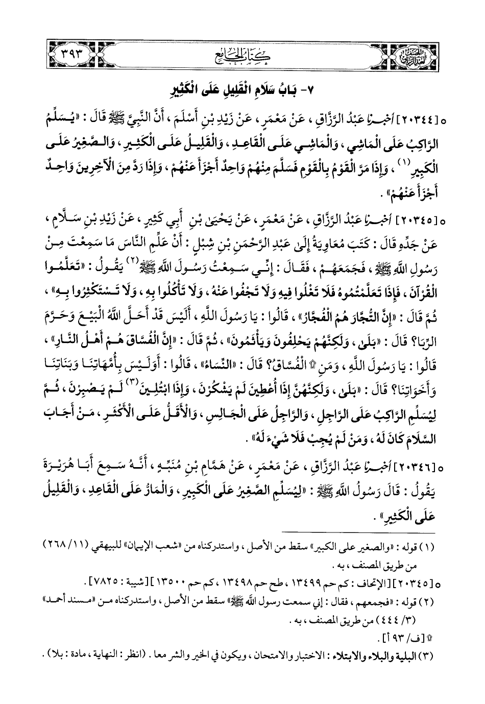 20344- عبد الرزاق، عَنْ مَعْمَرٍ، عَن زَيْدِ بْنِ أَسْلَمَ، أَنَّ النَّبِيَّ صَلَّى اللهُ عَلَيْهِ وَسَلَّمَ قَالَ: يُسَلِّمُ الرَّاكِبُ عَلَى المَاشِي، وَالمَاشِي عَلَى الْقَاعِدِ، وَالْقَلِيلُ عَلَى الْكَثِيرِ، وَالصَّغِيرُ عَلَى الْكَبِيرِ، وَإِذَا مَرَّ الْقَوْمُ بِالْقَوْمِ فَسَلَّمَ مِنْهُمْ وَاحِدٌ، أَجْزَأَ عَنْهُمْ، وَإِذَا رَدَّ مِنَ الآخَرِينَ وَاحِدٌ، أَجْزَأَ عَنْهُمْ.