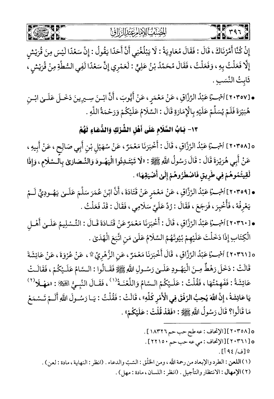 20361- أخبرنا عبد الرزاق، قَالَ: أَخْبَرَنَا مَعْمَرٌ، عَنِ الزُّهْرِيِّ، عَن عُرْوَةَ، عَنْ عَائِشَةَ، قَالَتْ: دَخَلَ رَهْطٌ مِنَ الْيَهُودِ عَلَى رَسُولِ اللهِ صَلَّى اللهُ عَلَيْهِ وَسَلَّمَ، فَقَالُوا: السَّامُ عَلَيْكُمْ، فَقَالَتْ عَائِشَةُ: فَفَهِمْتُهَا، فَقُلْتُ: عَلَيْكُمُ السَّامُ وَاللَّعْنَةُ، فَقَالَ النَّبِيُّ عَلَيْهِ السَّلاَمُ: مَهْلاً يَا عَائِشَةُ، إِنَّ اللهَ يُحِبُّ الرِّفْقَ فِي الأَمْرِ كُلِّهِ، قَالَتْ: فَقُلْتُ: يَا رَسُولَ اللهِ، أَلَمْ تَسْمَعْ مَا قَالُوا؟ قَالَ رَسُولُ اللهِ صَلَّى اللهُ عَلَيْهِ وَسَلَّمَ: فَقَدْ قُلْتُ: عَلَيْكُمْ.