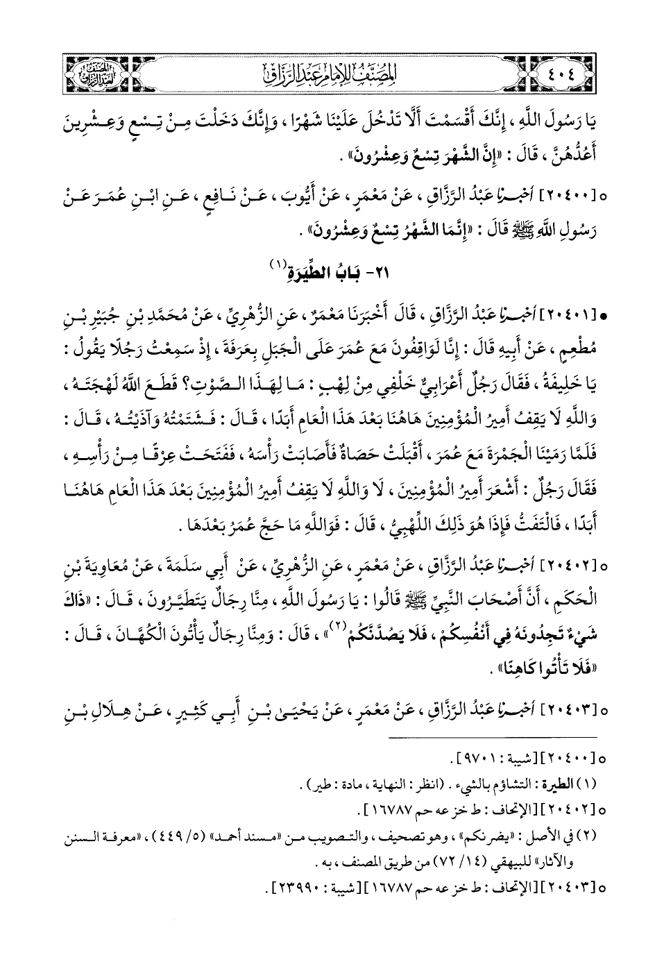 20400- أخبرنا عبد الرزاق، عَنْ مَعْمَرٍ، عَنْ أَيُّوبَ، عَن نَافِعٍ، عَنِ ابْنِ عُمَرَ، عَن رَسُولِ اللهِ صَلَّى اللهُ عَلَيْهِ وَسَلَّمَ قَالَ: إِنَّمَا الشَّهْرُ تِسْعٌ وَعِشْرُونَ.