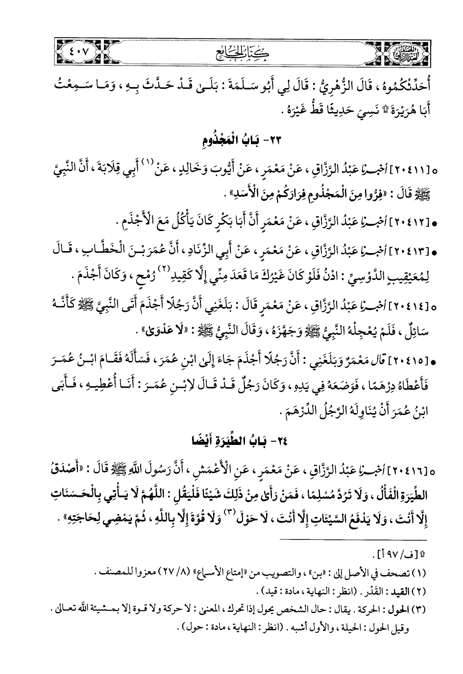 20416- أخبرنا عبد الرزاق، عَنْ مَعْمَرٍ، عَنِ الأَعمَشِ، أَنَّ رَسُولَ اللهِ صَلَّى اللهُ عَلَيْهِ وَسَلَّمَ قَالَ: أَصْدَقُ الطِّيَرَةِ الْفَأْلُ، وَلاَ تَرُدُّ مُسْلِمًا، فَمَنْ رَأَى مِنْ ذَلِكَ شَيْئًا فَلْيَقُلِ: اللهُمَّ لاَ يَأْتِي بِالْحَسَنَاتِ إِلاَّ أَنْتَ، وَلاَ يَدْفَعُ السَّيِّئَاتِ إِلاَّ أَنْتَ، لاَ حَوْلَ وَلاَ قُوَّةَ إِلاَّ باللهِ، ثُمَّ يَمْضِي لِحَاجَتِهِ.