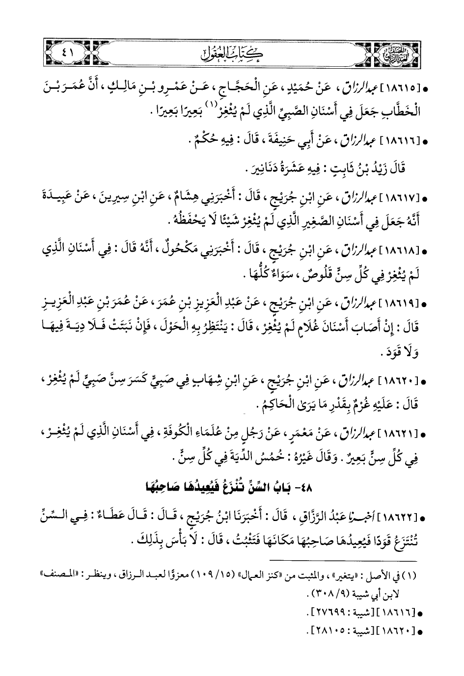 18621- عبد الرزاق، عَنْ مَعْمَرٍ، عَن رَجُلٍ مِنْ عُلَمَاءِ الْكُوفَةِ، فِي أَسْنَانِ الَّذِي لَمْ يُثْغِرْ، فِي كُلِّ سِنٍّ بَعِيرٌ.