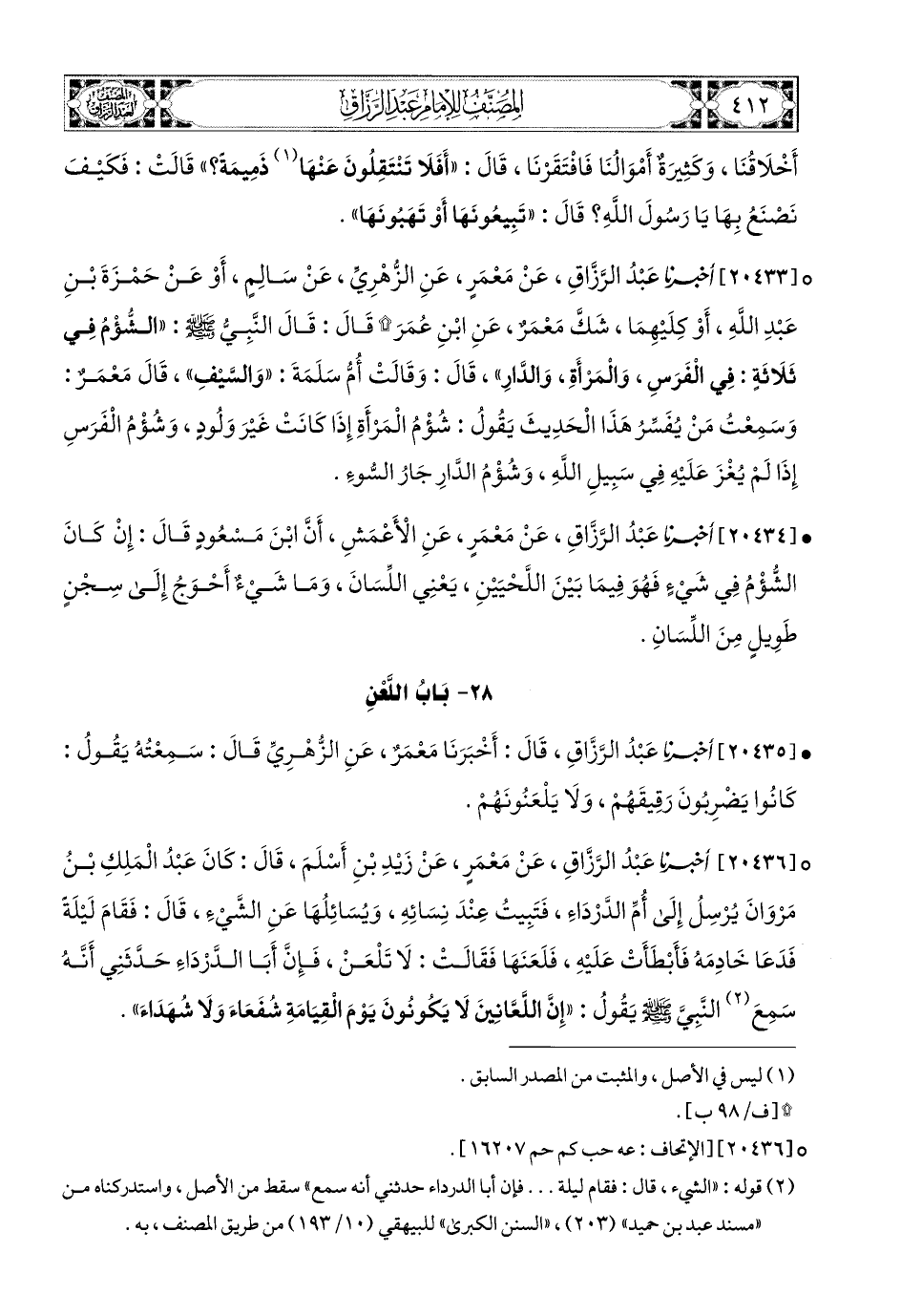 20436- أخبرنا عبد الرزاق، عَنْ مَعْمَرٍ، عَن زَيْدِ بْنِ أَسْلَمَ، قَالَ: كَانَ عَبدُ المَلِكِ بن مَرْوَانَ يُرْسِلُ إِلَى أُمِّ الدَّرْدَاءِ، فَتَبِيتُ عِنْدَ نِسَائِهِ، وَيُسَائِلُهَا عَنِ الشَّيْءِ، قَالَ: فَقَامَ لَيْلَةً، فَدَعَا خَادِمَهُ، فَأَبْطَتْ عَلَيْهِ، فَلَعَنَهَا، فَقَالَتْ: لاَ تَلْعَنْ، فَإِنَّ أَبَا الدَّرْدَاءِ حَدَّثَنِي، أَنَّهُ سَمِعَ النَّبِيَّ صَلَّى اللهُ عَلَيْهِ وَسَلَّمَ يَقُولُ: إِنَّ اللَّعَّانِينَ لاَ يَكُونُونَ يَوْمَ الْقِيَامَةِ شُفَعَاءَ وَلاَ شُهَدَاءَ.