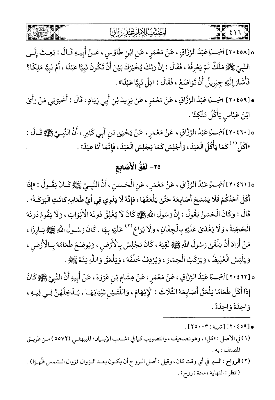 20462- أخبرنا عبد الرزاق، عَنْ مَعْمَرٍ، عَن هِشَامِ بْنِ عُرْوَةَ، عَنْ أَبِيهِ، أَنَّ النَّبِيَّ صَلَّى اللهُ عَلَيْهِ وَسَلَّمَ كَانَ إِذَا أَكَلَ طَعَامًا، يَلْعَقُ أَصَابِعَهُ الثَّلاَثَ: الإِبْهَامَ، وَاللَّتَيْنِ تَلِيَانِهَا، يُدْخِلُهُنَّ فِي فِيهِ، وَاحِدَةً وَاحِدَةً.