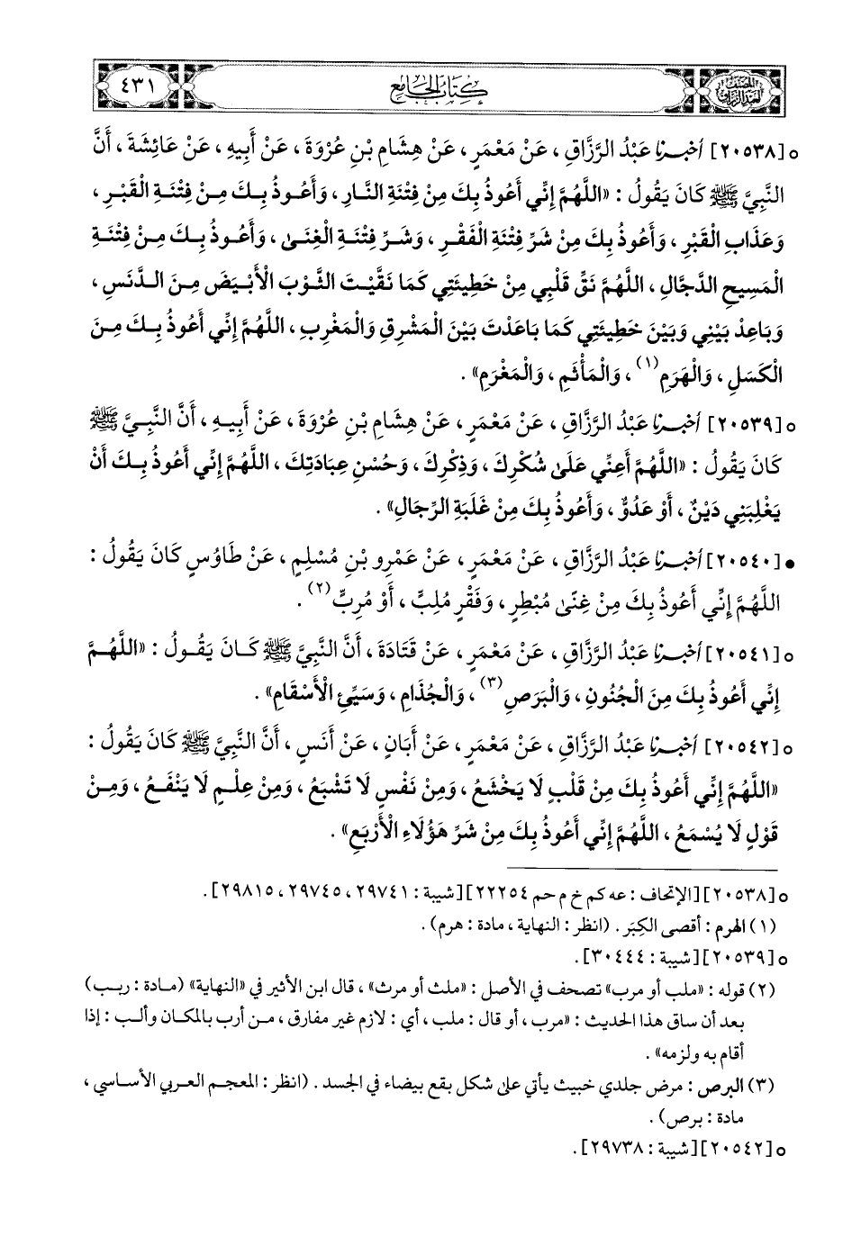 20541- أخبرنا عبد الرزاق، عَنْ مَعْمَرٍ، عَن قَتَادَةَ، أَنَّ النَّبِيَّ صَلَّى اللهُ عَلَيْهِ وَسَلَّمَ كَانَ يَقُولُ: اللهُمَّ إِنِّي أَعُوذُ بِكَ مِنَ الْجُنُونِ، وَالْبَرَصِ، وَالْجُذَامِ، وَسَيِّءِ الأَسْقَامِ.