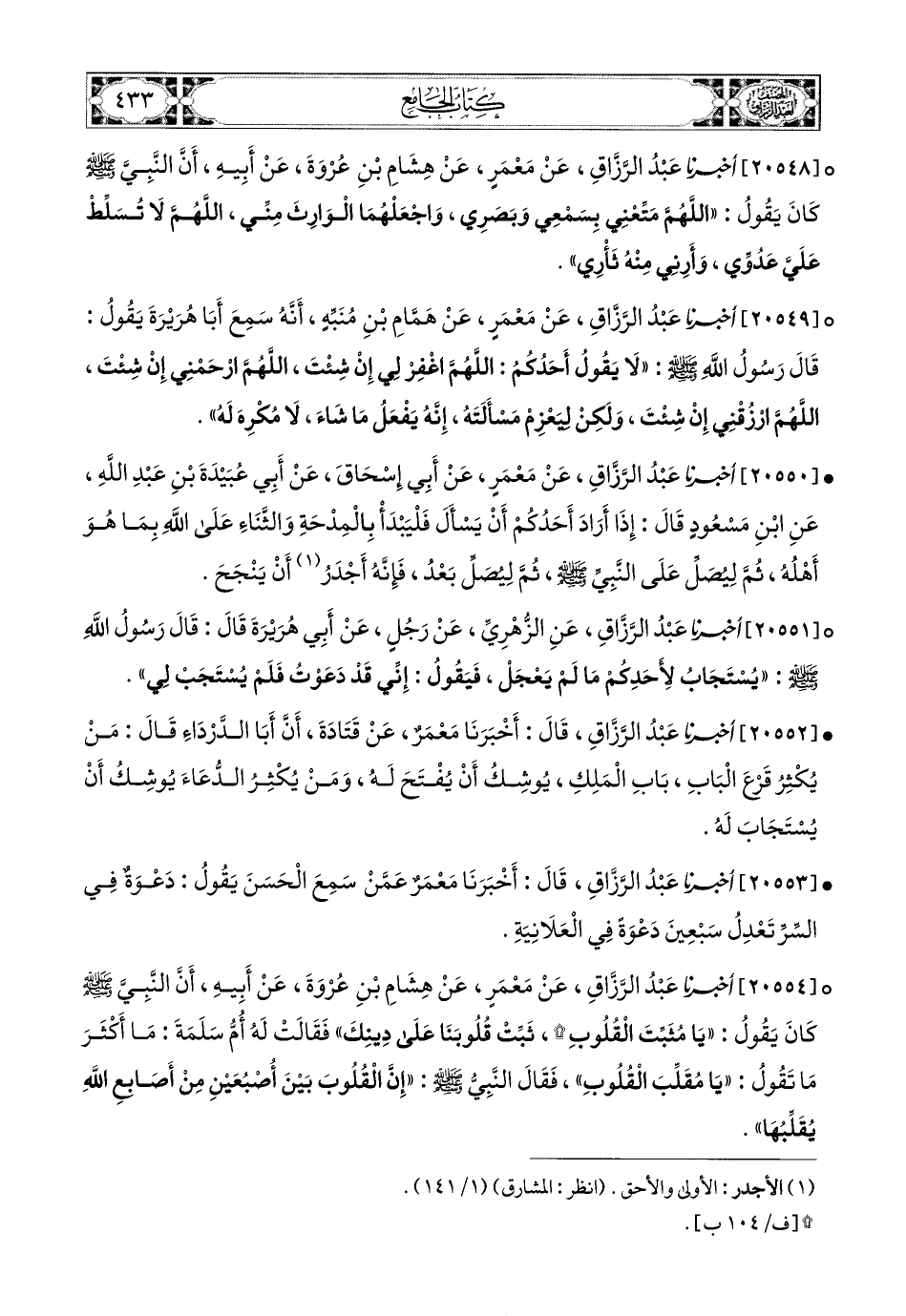 20552- أخبرنا عبد الرزاق، قَالَ: أَخْبَرَنَا مَعْمَرٌ، عَن قَتَادَةَ، أَنَّ أَبَا الدَّرْدَاءِ، قَالَ مَنْ يُكْثِرْ قَرْعَ الْبَابِ، بَابِ المَلِكِ، يُوشِكْ أَنْ يُفْتَحَ لَهُ، وَمَنْ يُكْثِرِ الدُّعَاءَ، يُوشِكْ أَنْ يُسْتَجَابَ لَهُ.